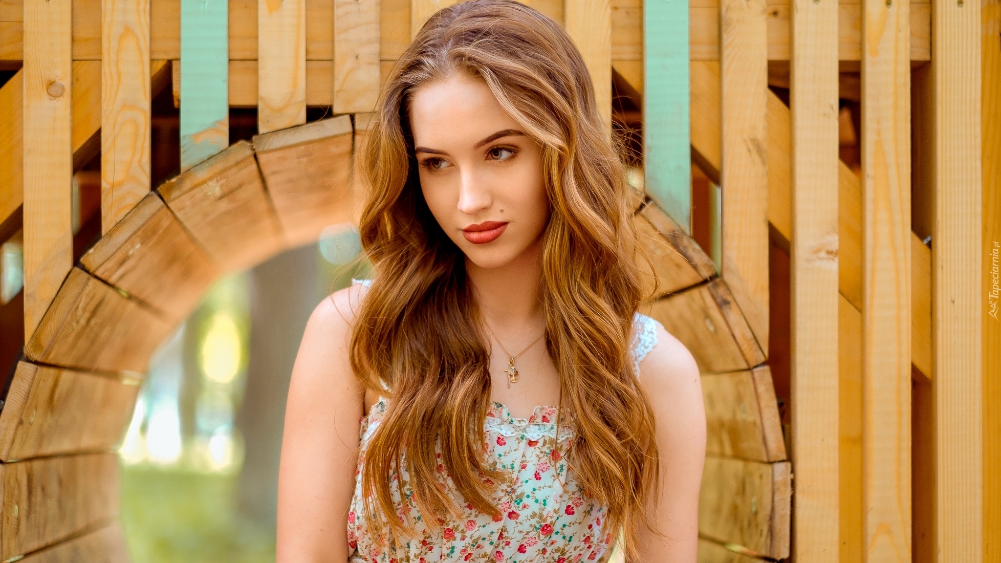 Edytor tapety: Długowłosa blondynka na tle desek