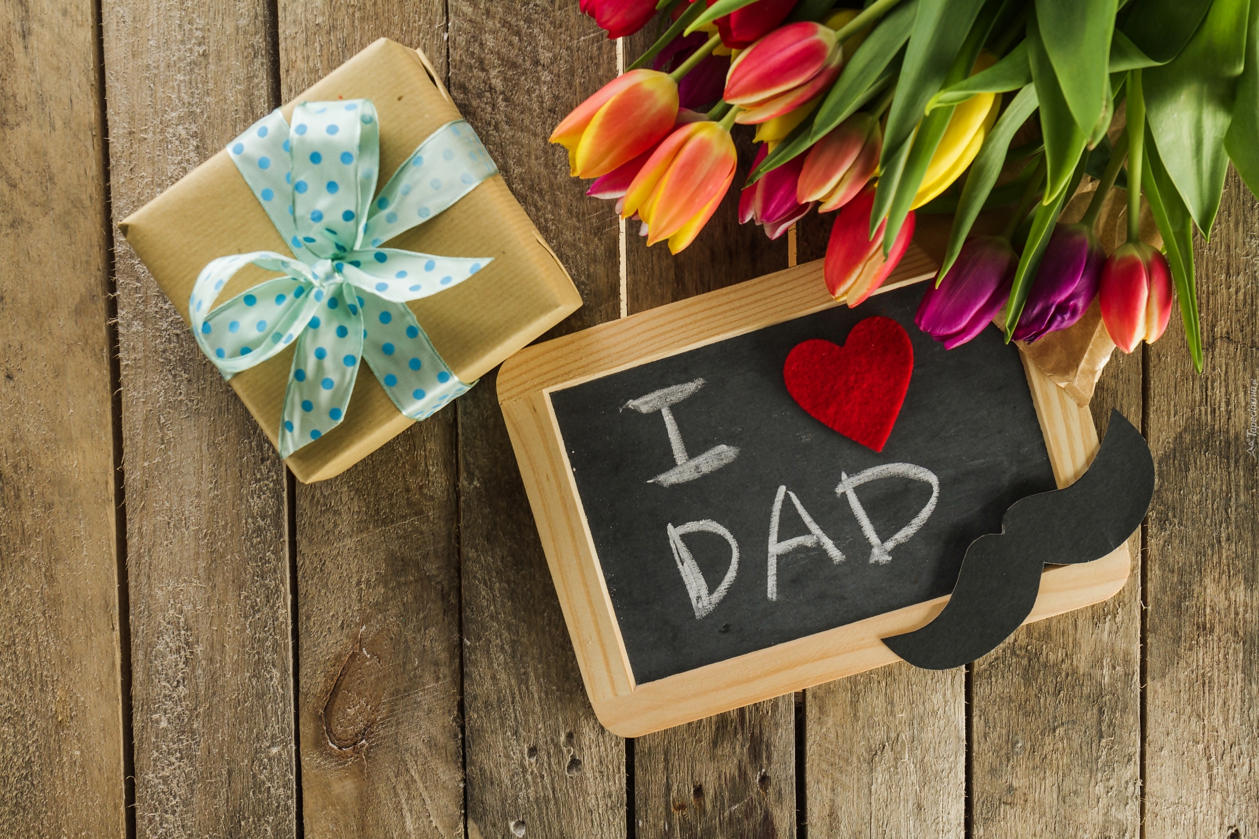 Edytor tapety: Bukiet tulipanów i prezent dla taty