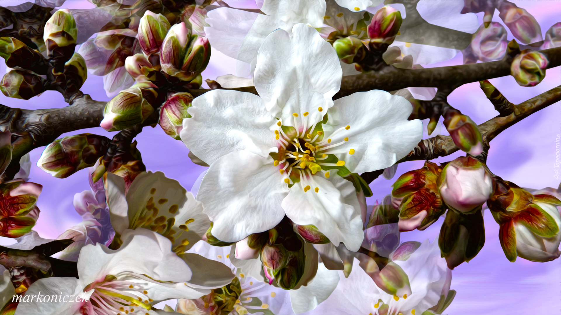 Edytor tapety: Rozwinięte kwiaty i pąki drzewa owocowego w grafice