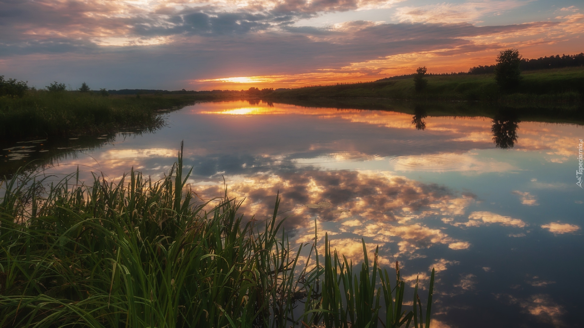 Edytor tapety: Trawy nad rzeką o zachodzie słońca