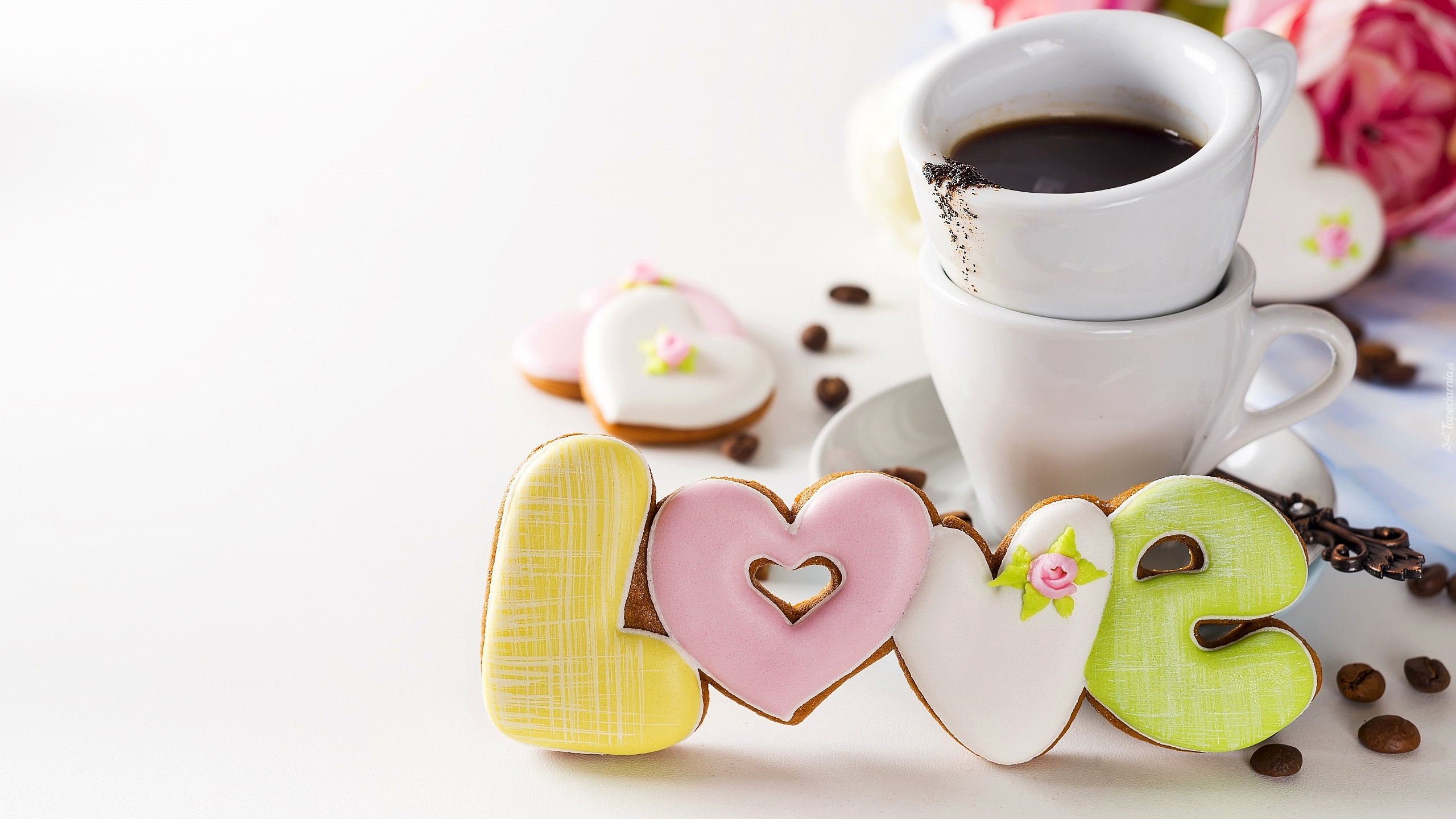 Edytor tapety: Napis love z ciasteczek obok filiżanek z kawą