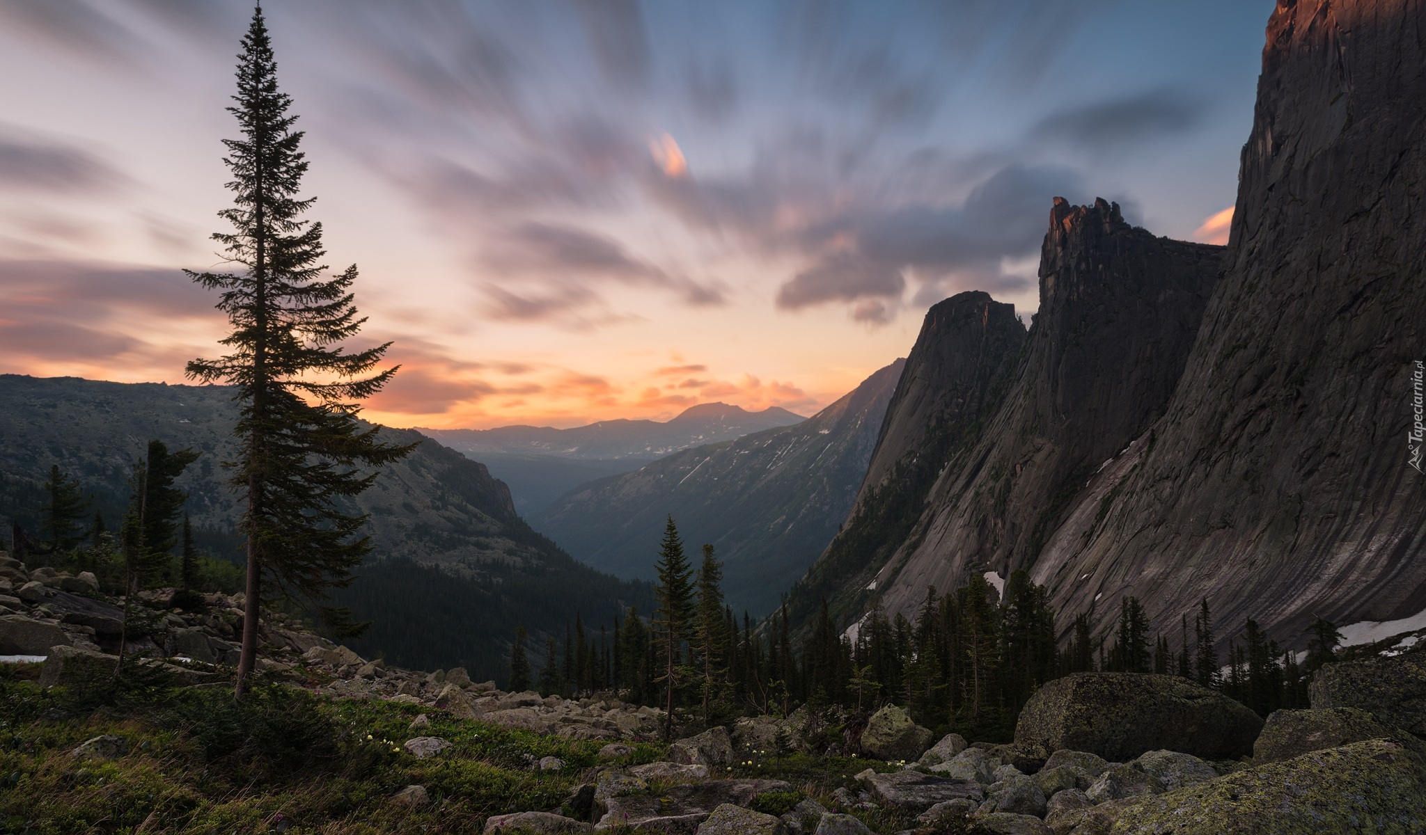 Edytor tapety: Świerki na tle gór o wschodzie słońca