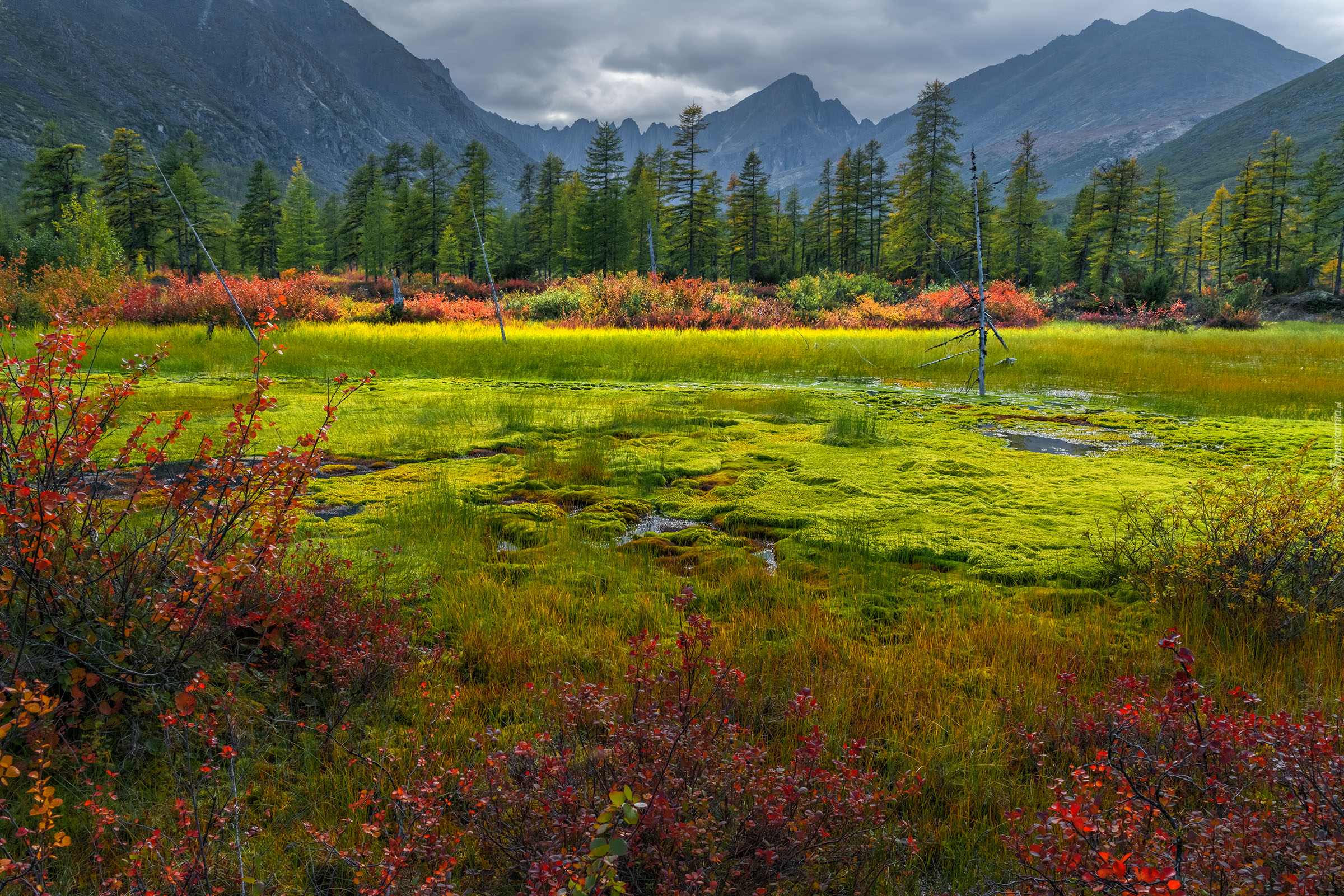 Edytor tapety: Zarośnięty brzeg jeziora Jacka Londona w górach Kołymskich