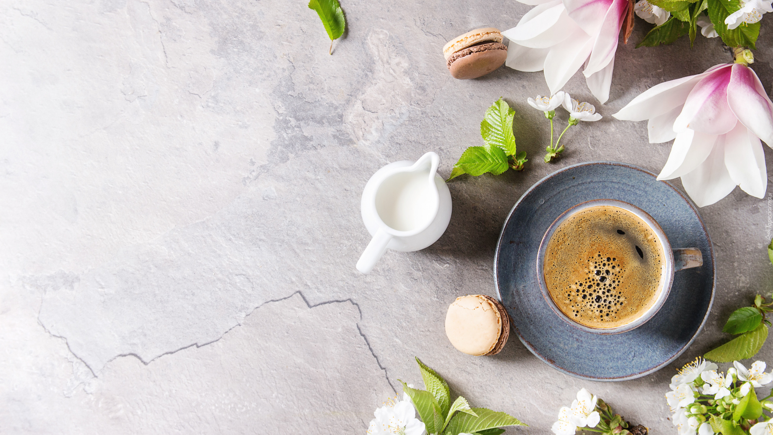 Edytor tapety: Kawa i mleko obok kwiatów magnolii