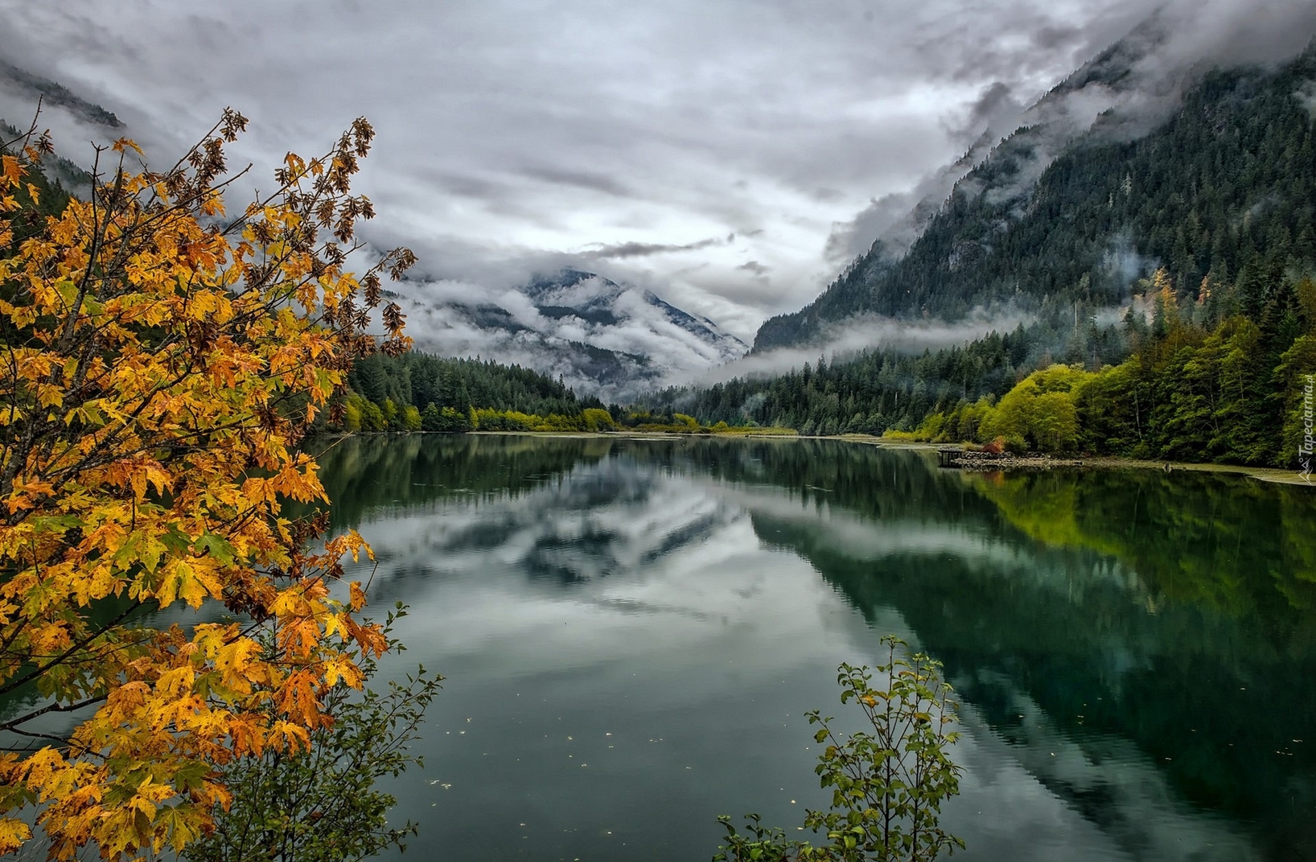 Edytor tapety: Górskie jezioro otoczone lasami