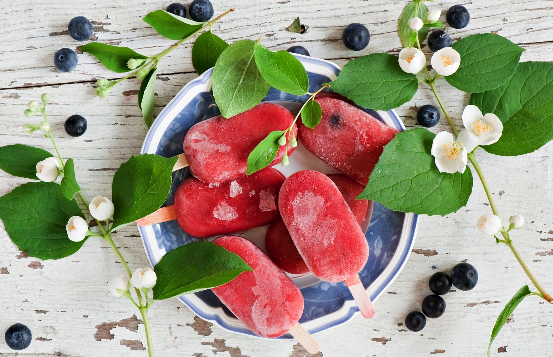 Edytor tapety: Lody na talerzu obok kwiatów jaśminowca