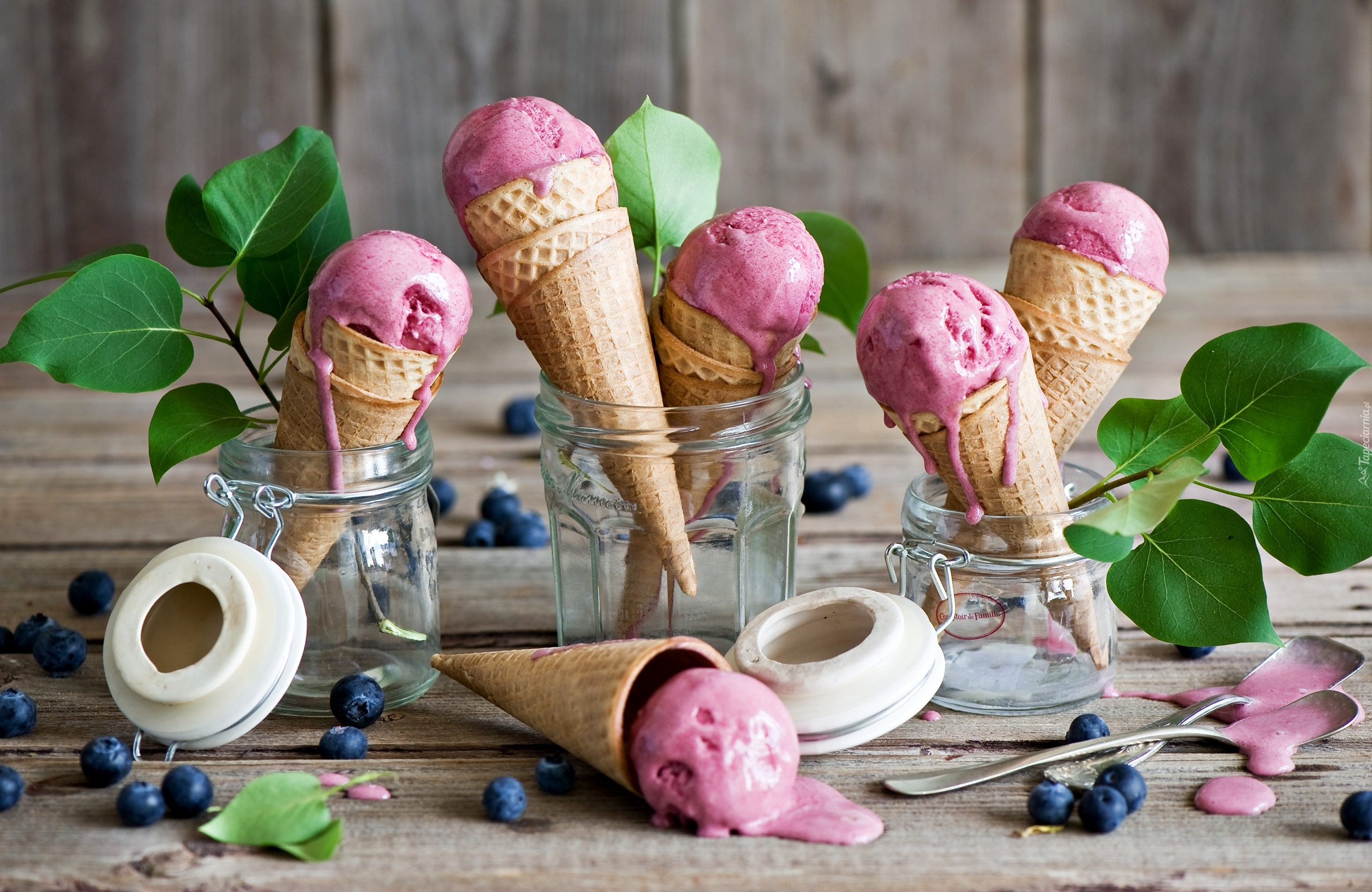 Edytor tapety: Lody owocowe w rożkach włożone do słoików