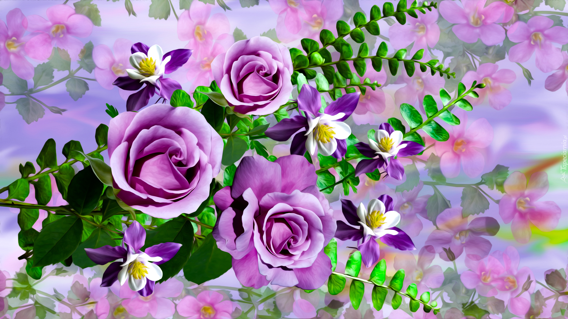 Edytor tapety: Róże i orliki w bukiecie z paprotką