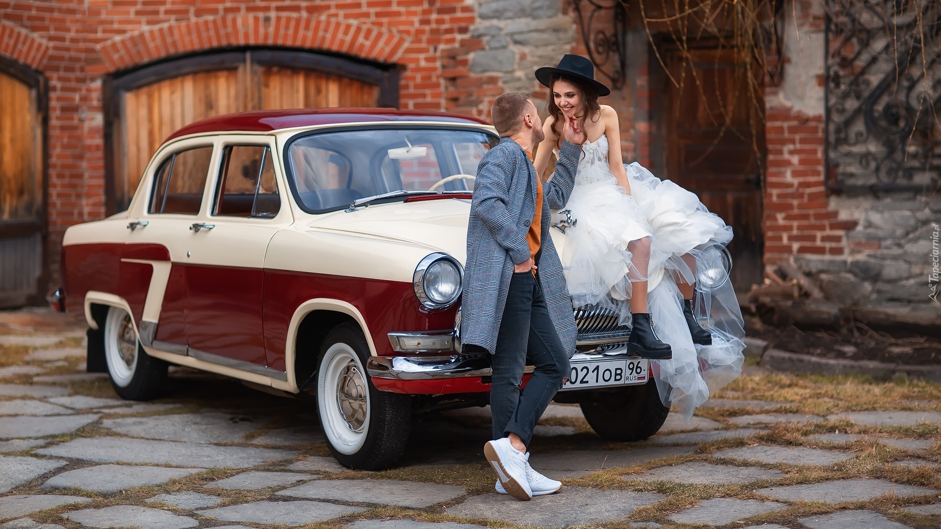 Edytor tapety: Dziewczyna i chłopak przy zabytkowym samochodzie