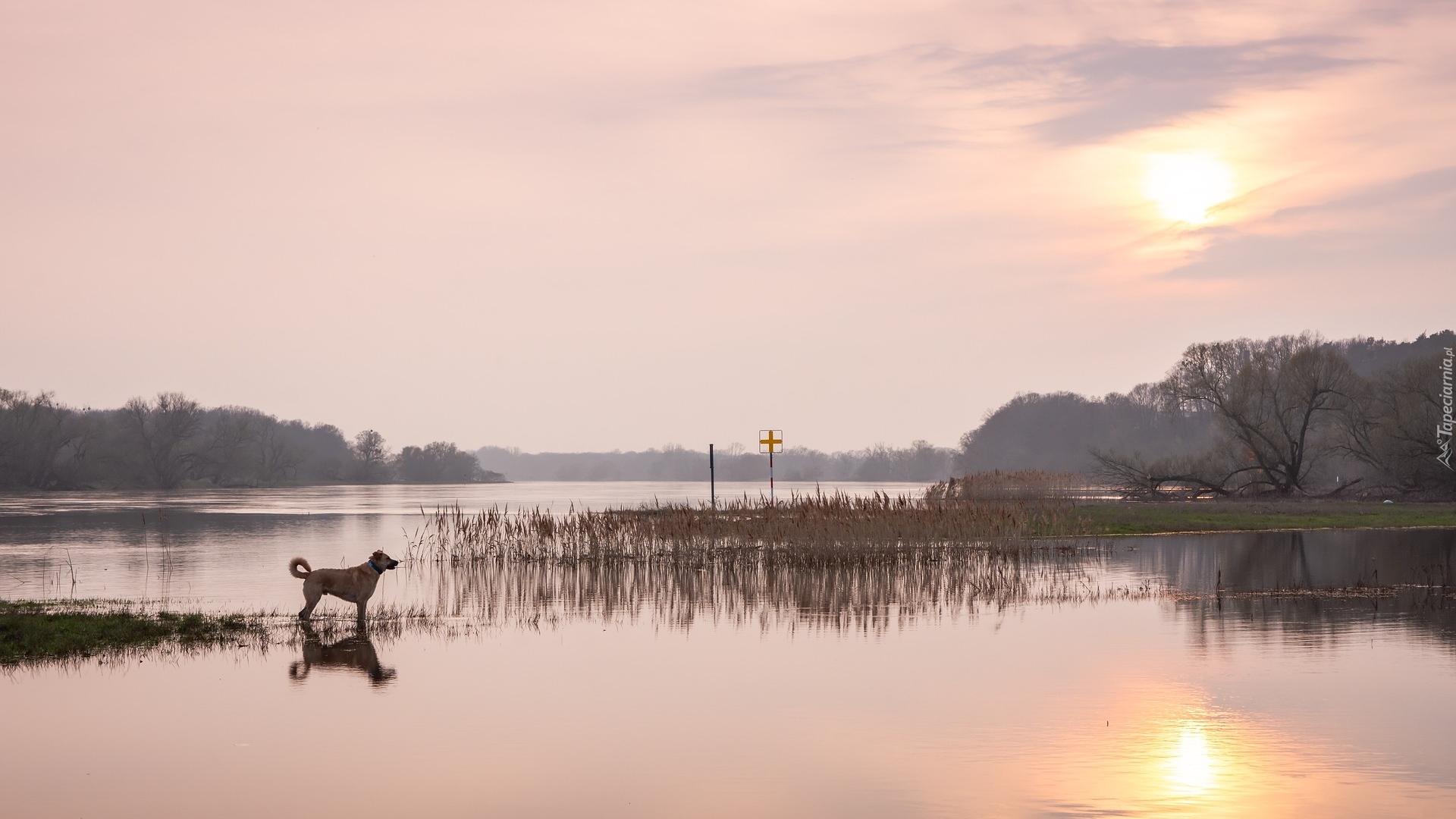 Edytor tapety: Pies nad rzeką o wschodzie słońca