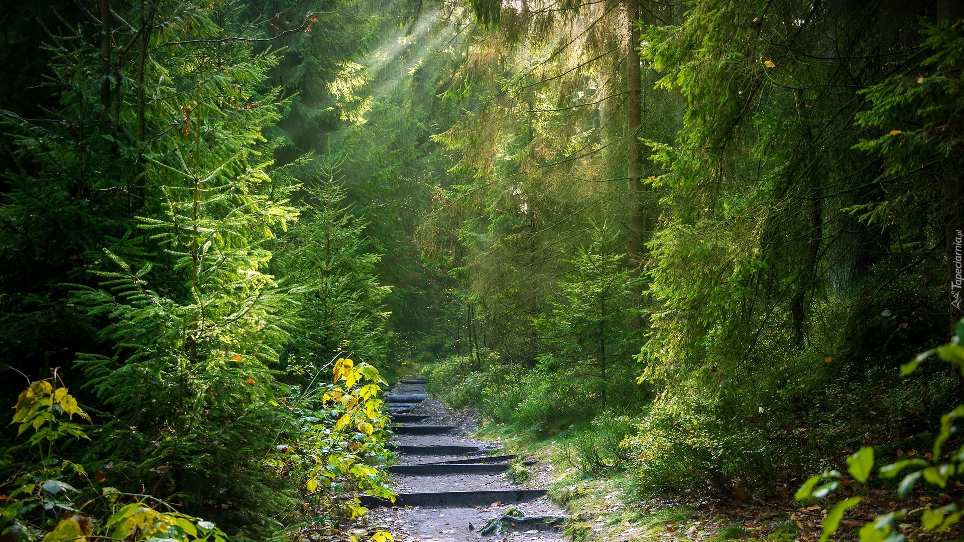 Edytor tapety: Światło słoneczne wpadające do lasu iglastego