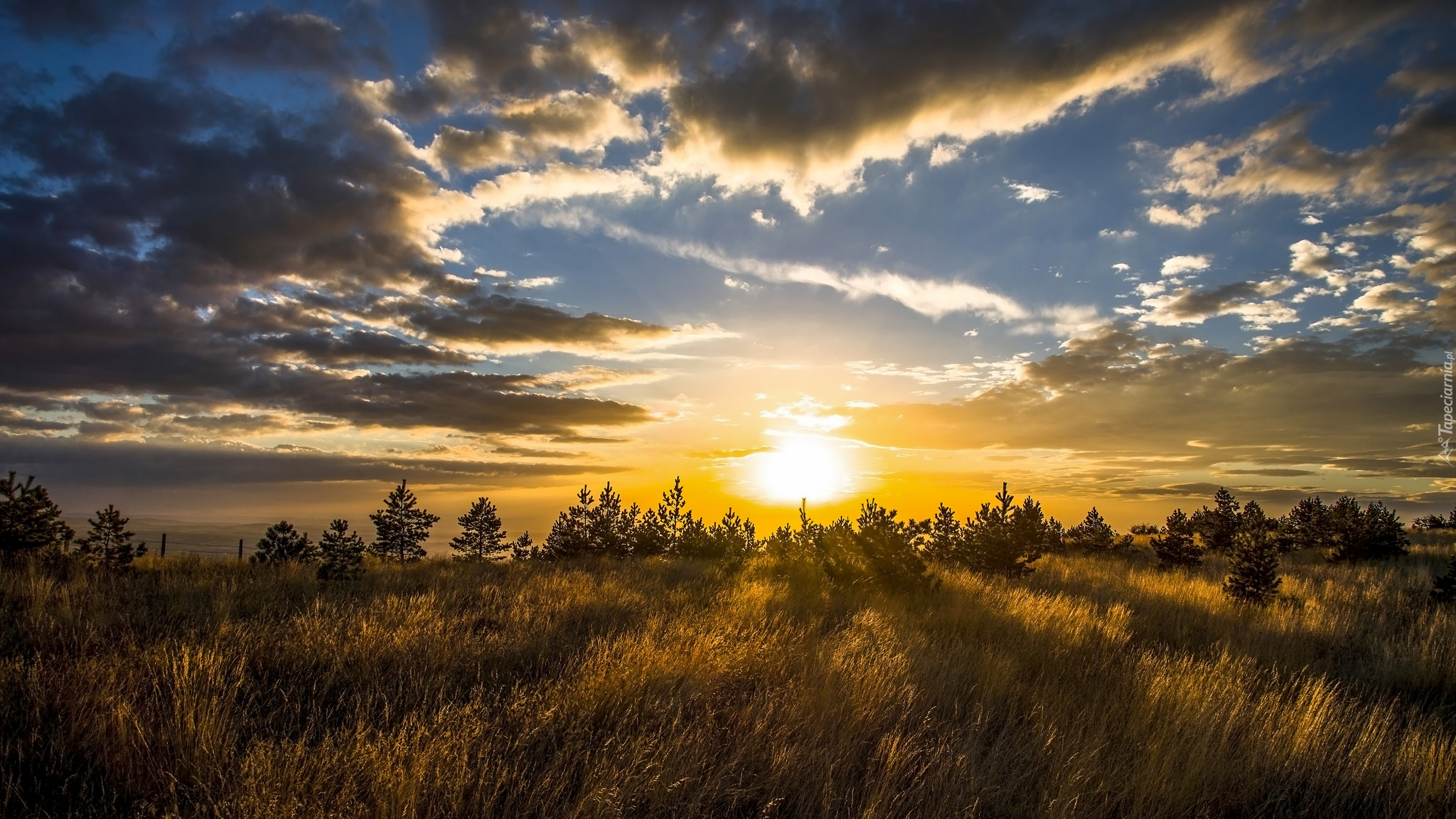 Edytor tapety: Wschodzące słońce nad łąką