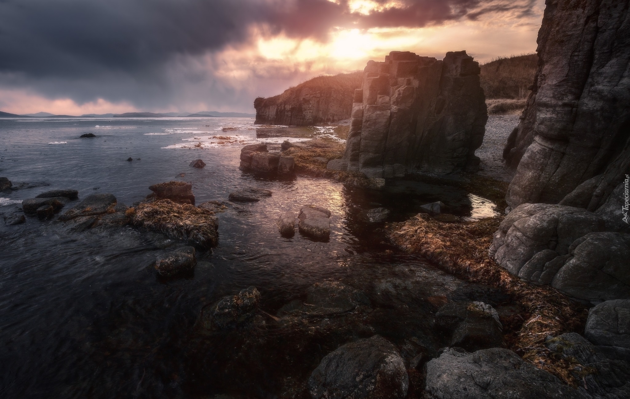 Edytor tapety: Ciemne chmury nad morskimi skalami