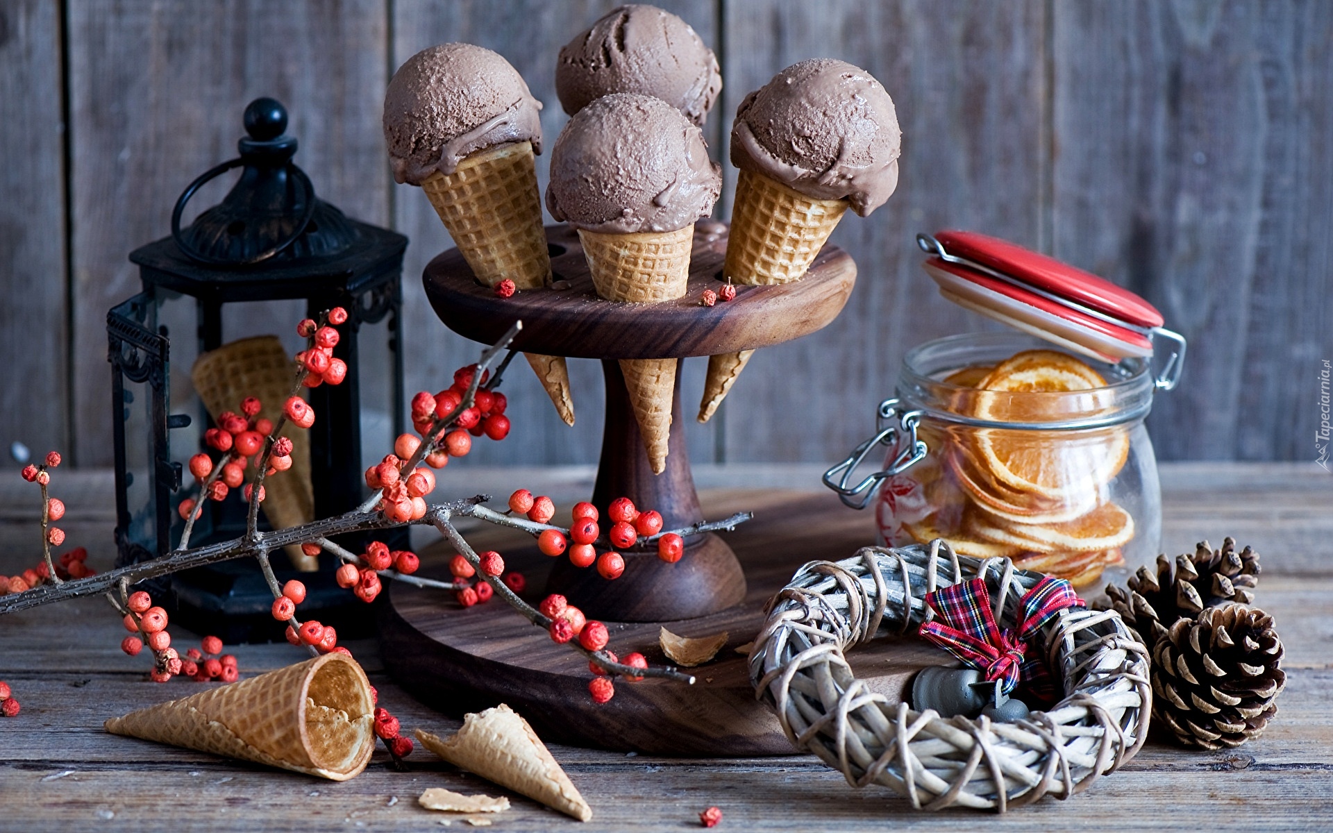 Edytor tapety: Lody rożki obok lampionu i czerwonych jagód