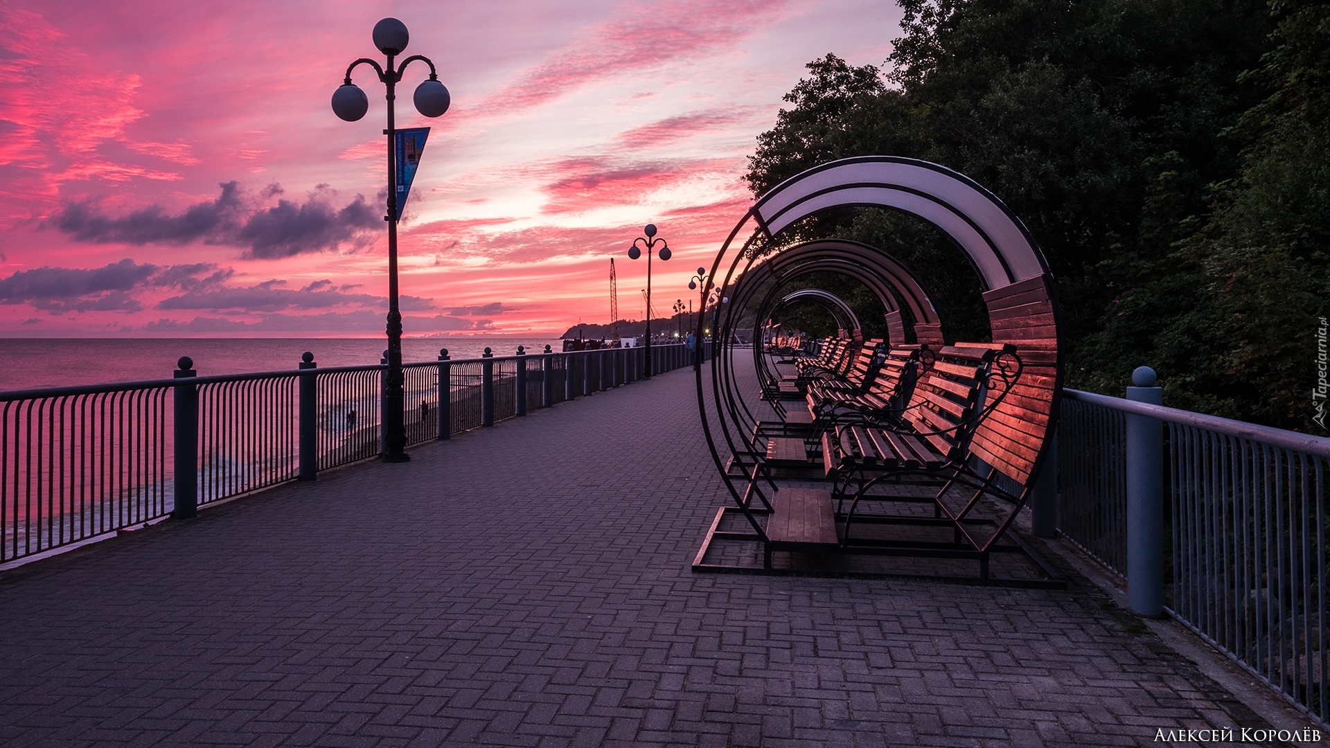 Edytor tapety: Promenada z ławeczkami i latarniami nad morzem