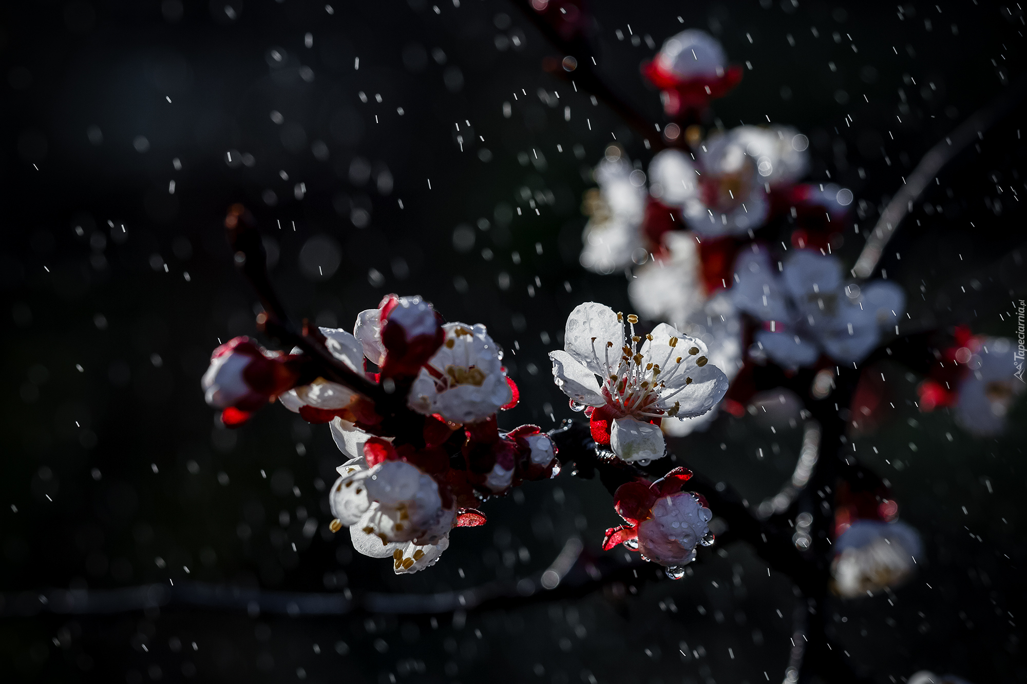 Edytor tapety: Krople wody na okwieconej gałązce