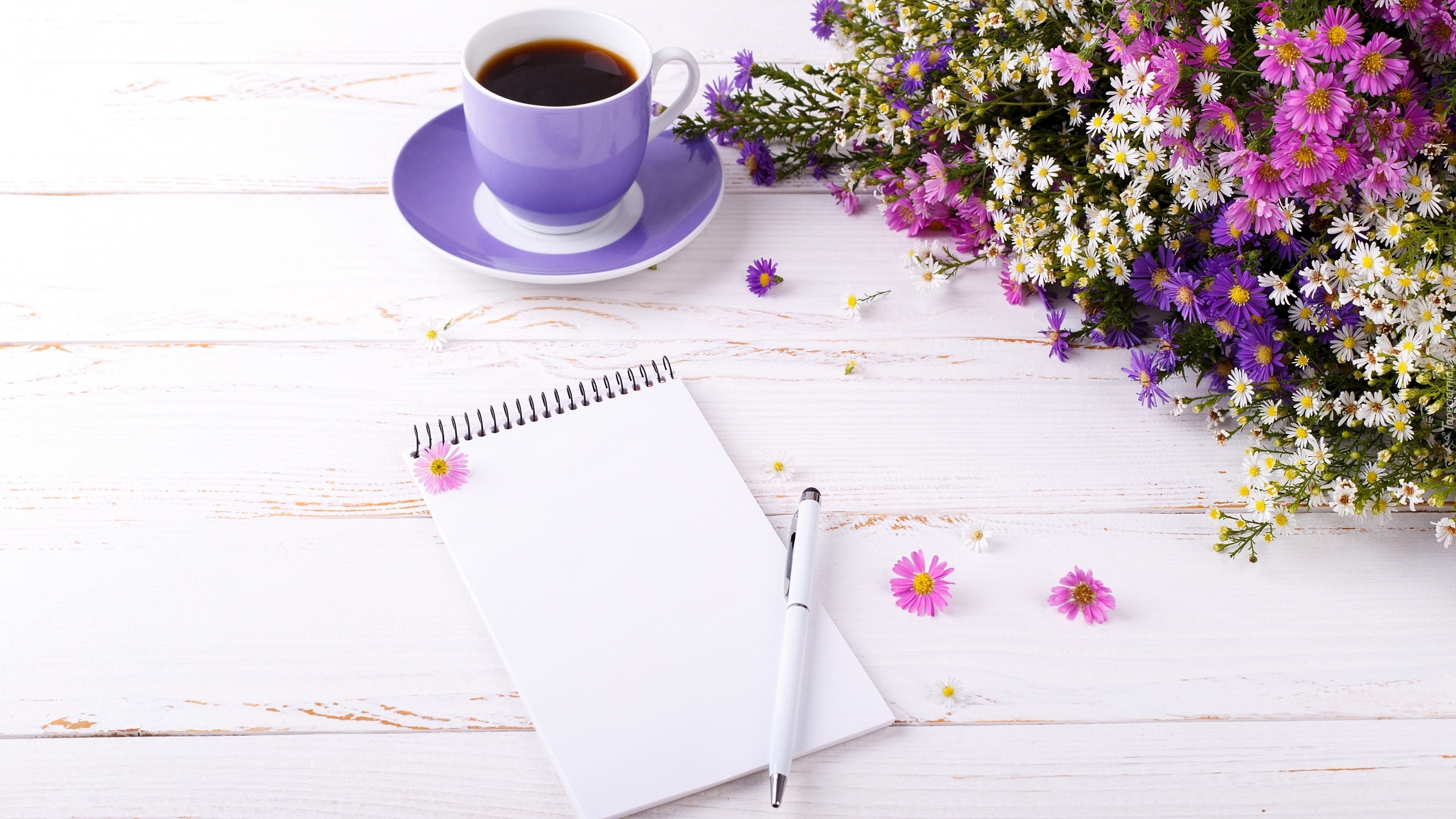 Edytor tapety: Astry i przymiotno obok filiżanki i notesu