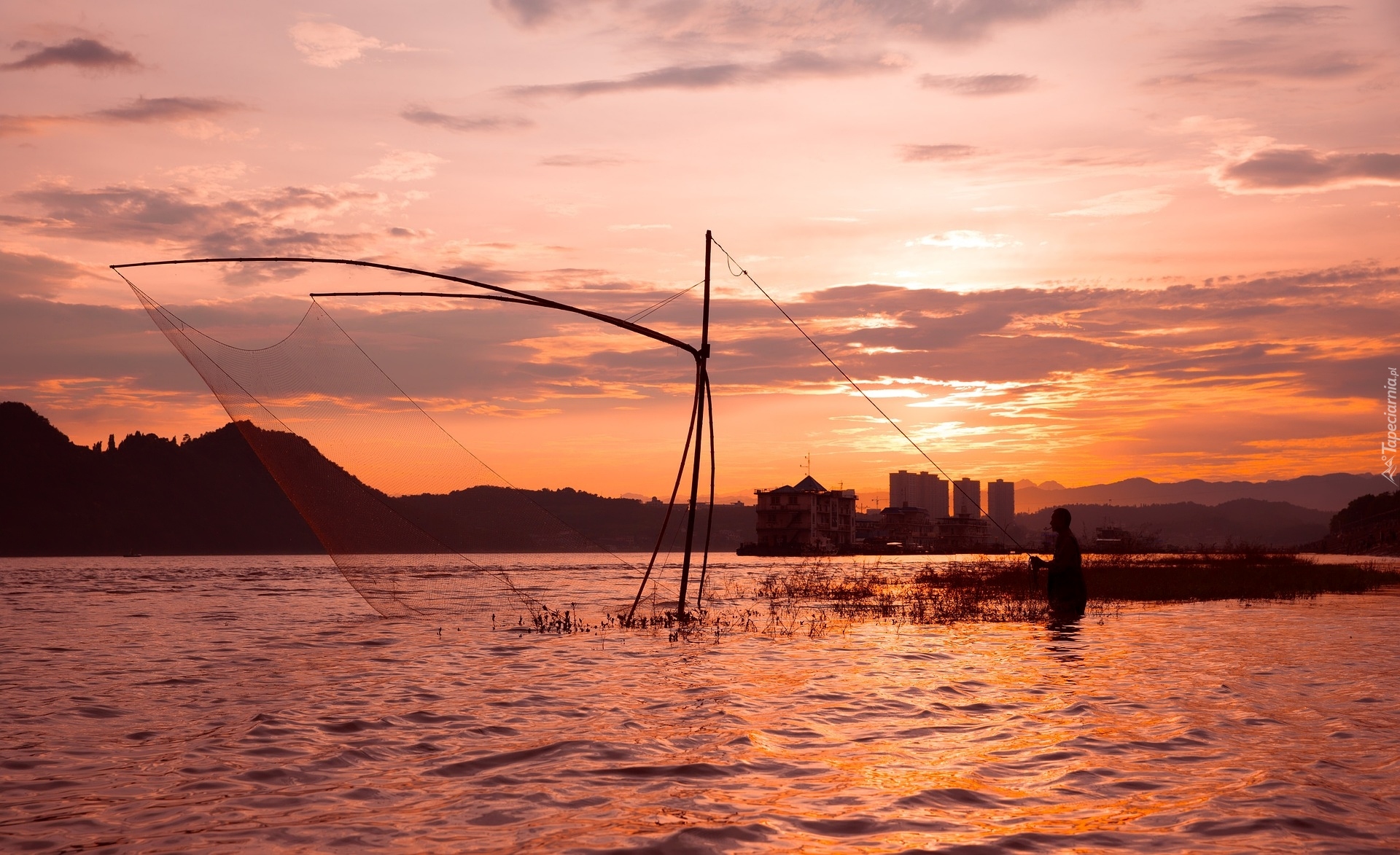 Edytor tapety: Rybak obok sieci na jeziorze