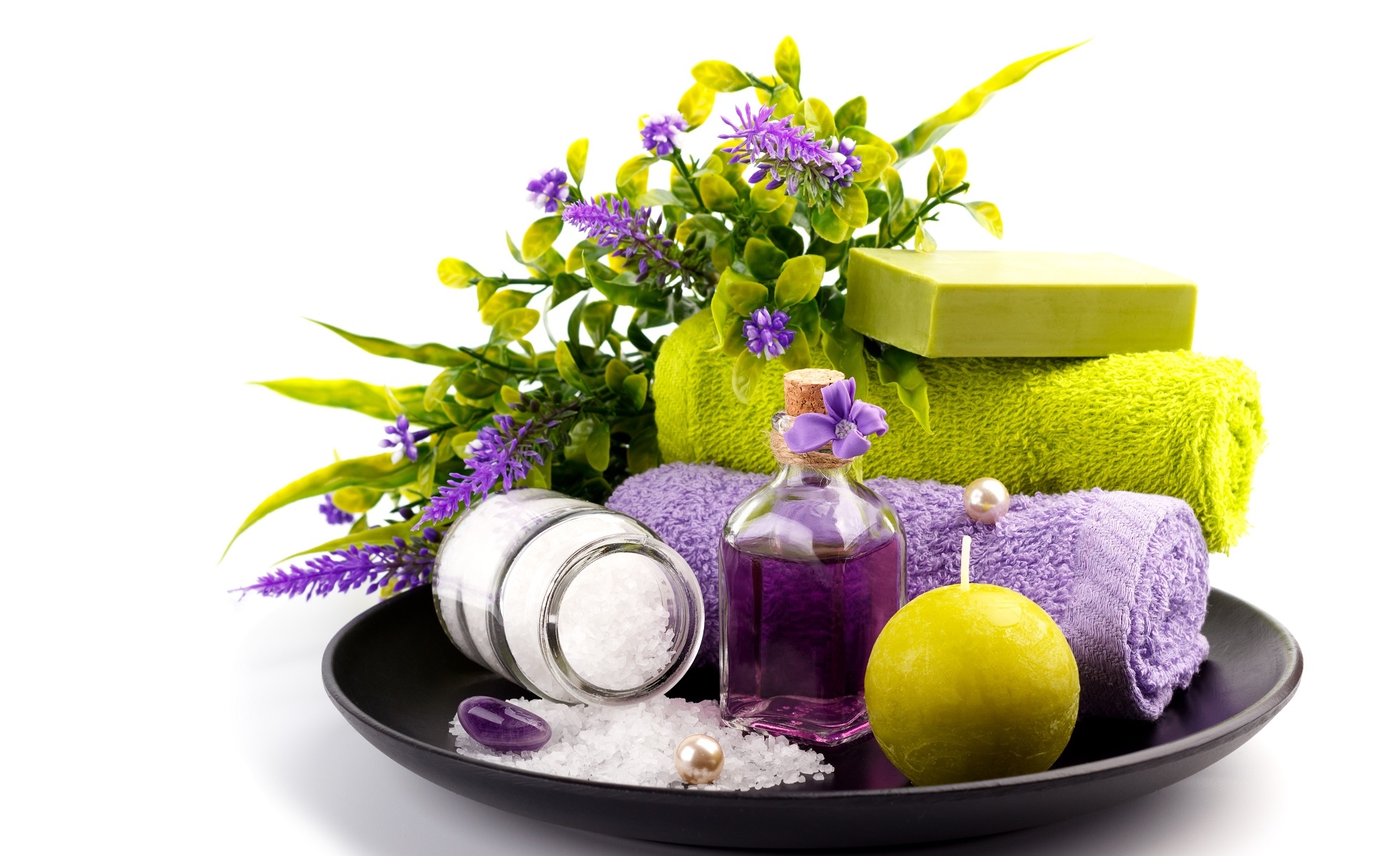 Edytor tapety: Kompozycja z solą i olejkiem obok ręczników