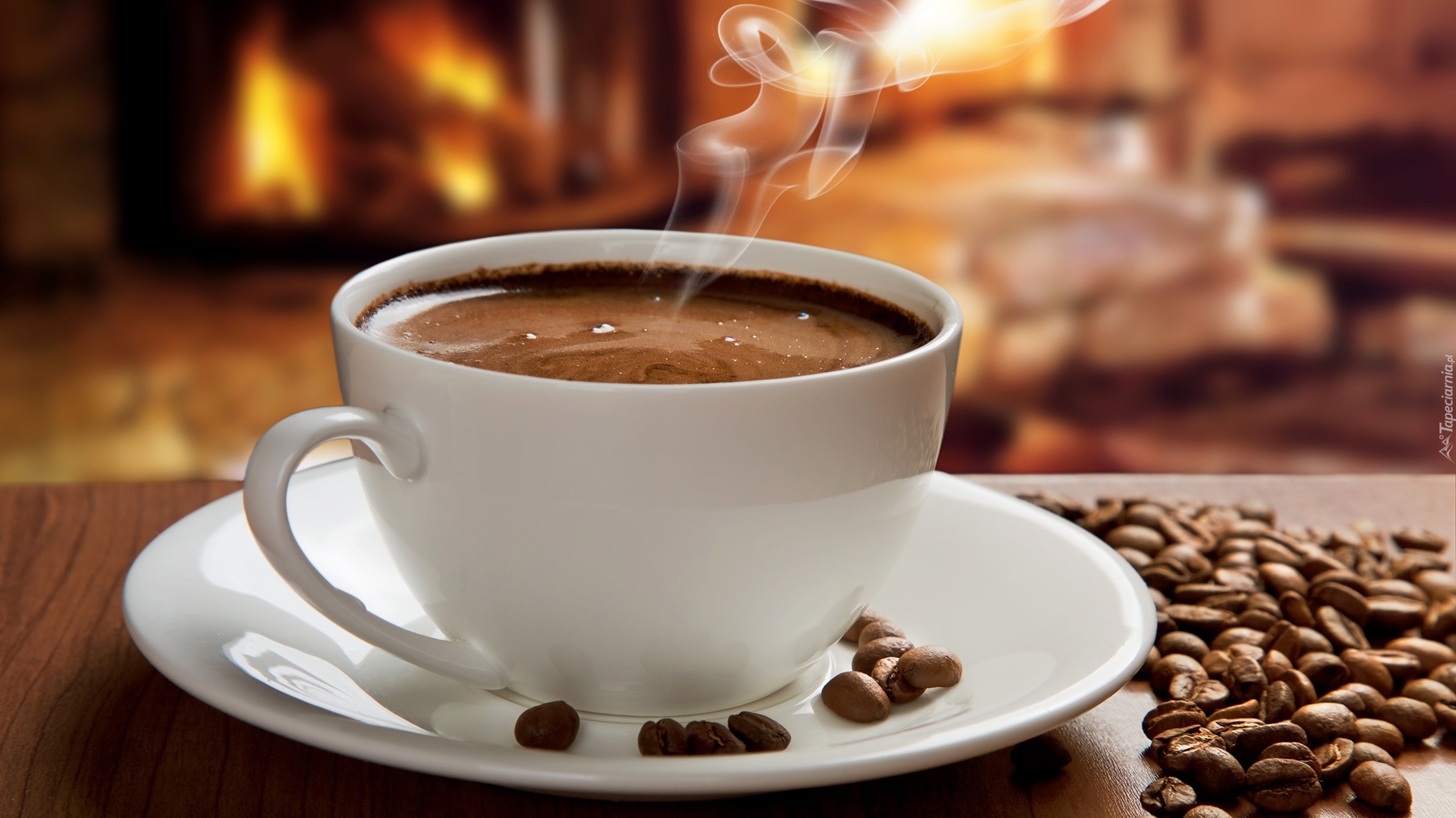 Edytor tapety: Biała filiżanka z kawą obok ziaren