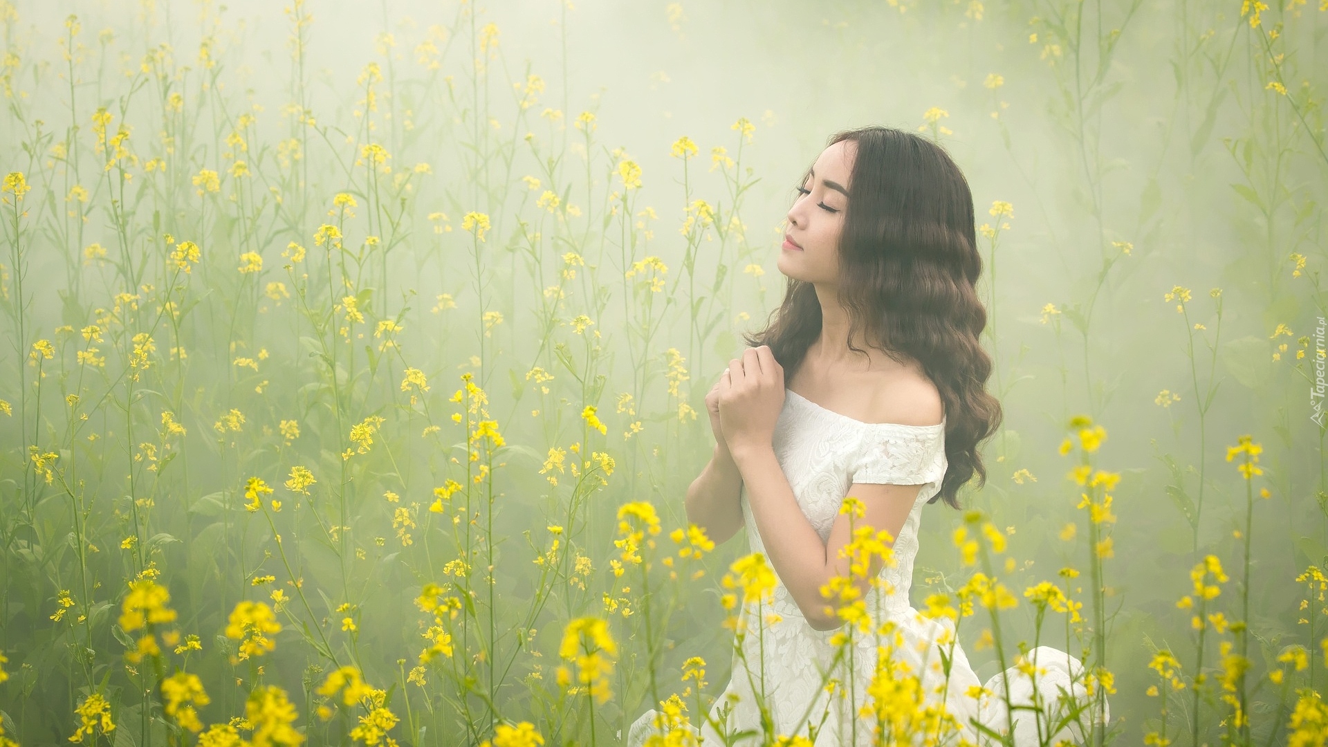 Edytor tapety: Dziewczyna pośród żółtych kwiatów we mgle