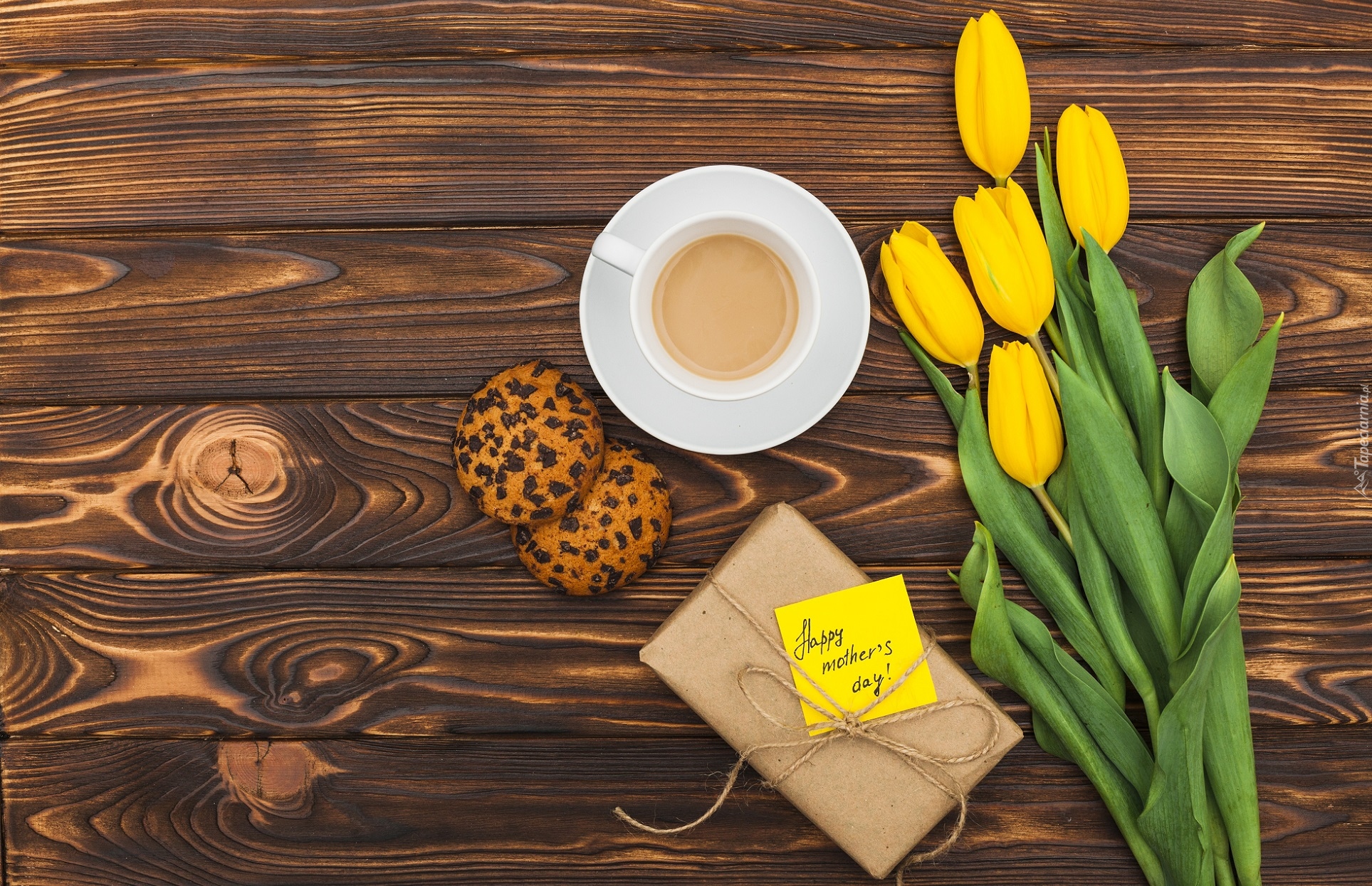 Edytor tapety: Prezent i żółte tulipany na Dzień Matki