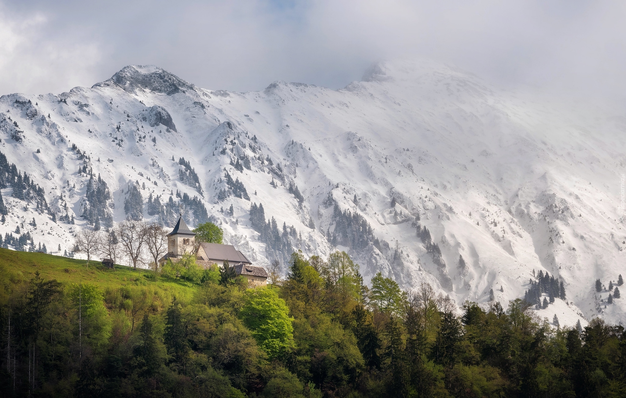 Edytor tapety: Kościół na tle ośnieżonych gór Karawanki w Słowenii