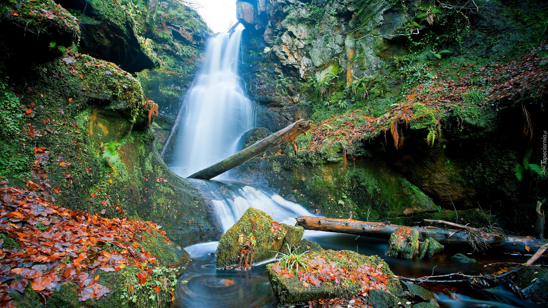 Edytor tapety: Wodospad pośród omszałych skał