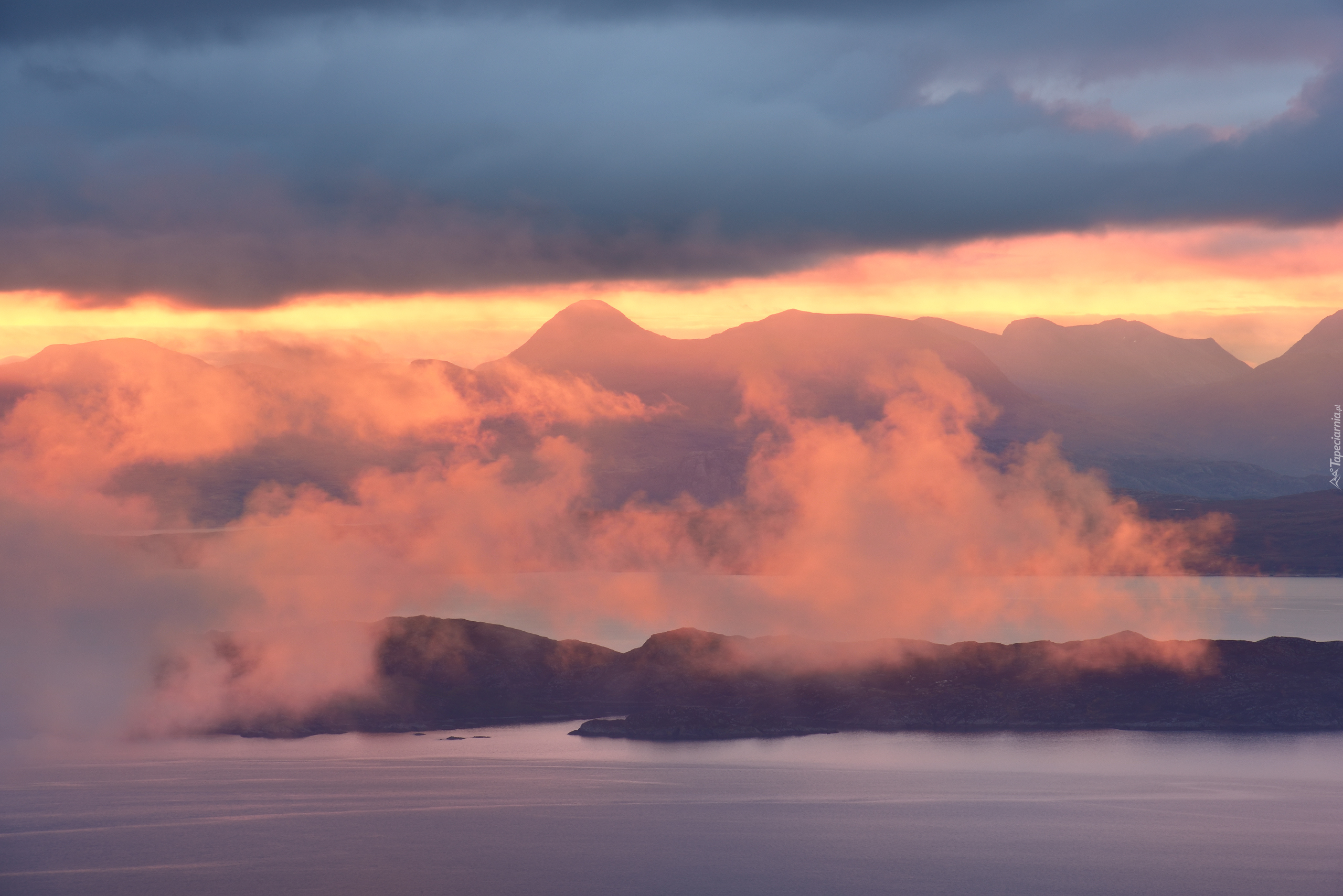 Edytor tapety: Wschód słońca nad mglistym jeziorem