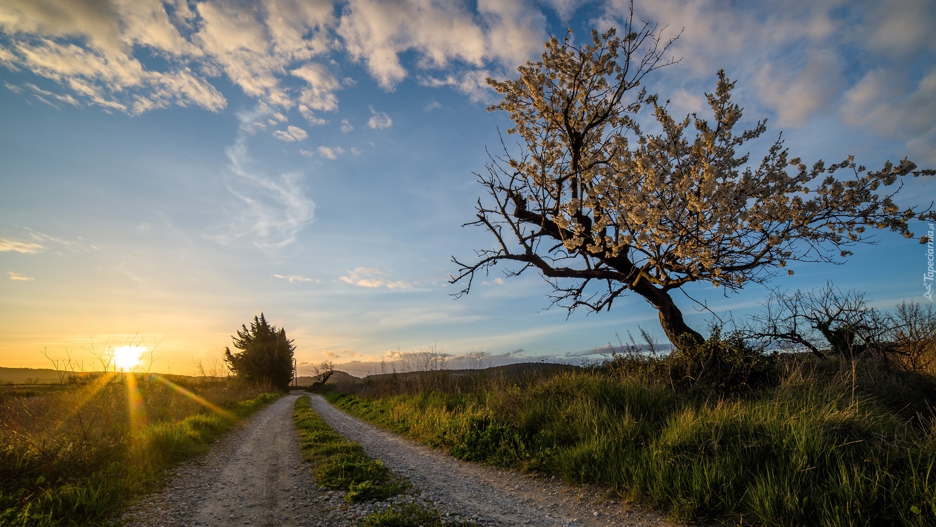 Edytor tapety: Polna droga w promieniach wschodzącego słońca