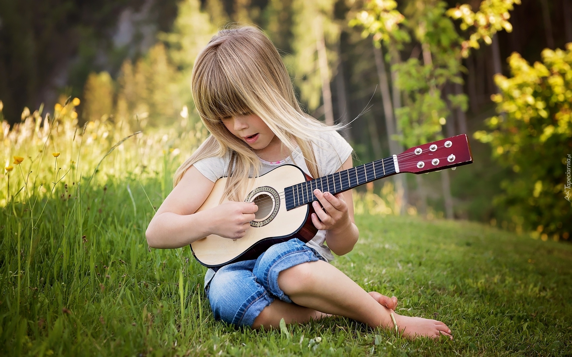 Edytor tapety: Dziewczynka z gitarą na łące