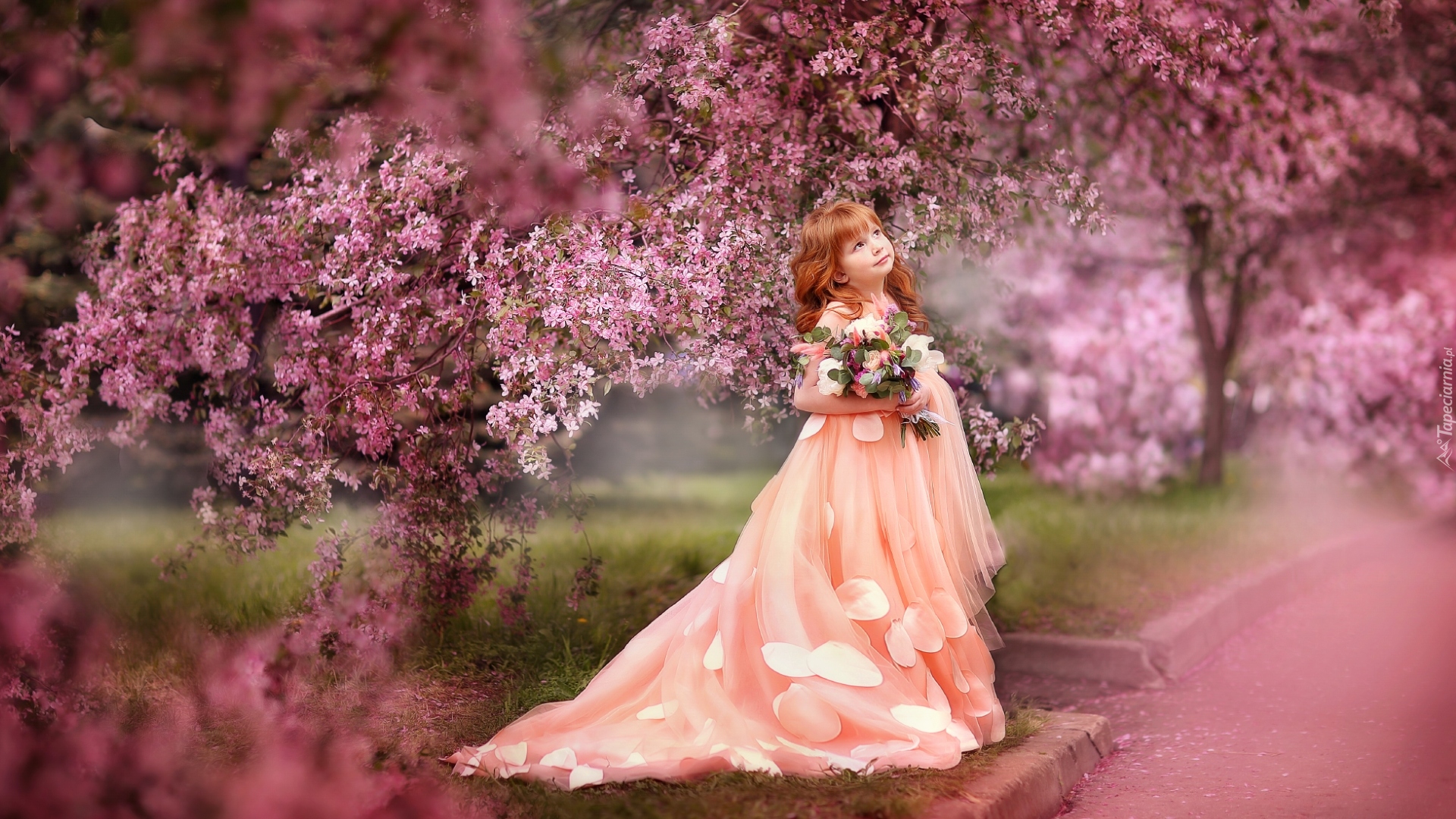 Edytor tapety: Dziewczynka z bukietem wśród kwitnących owocowych drzew