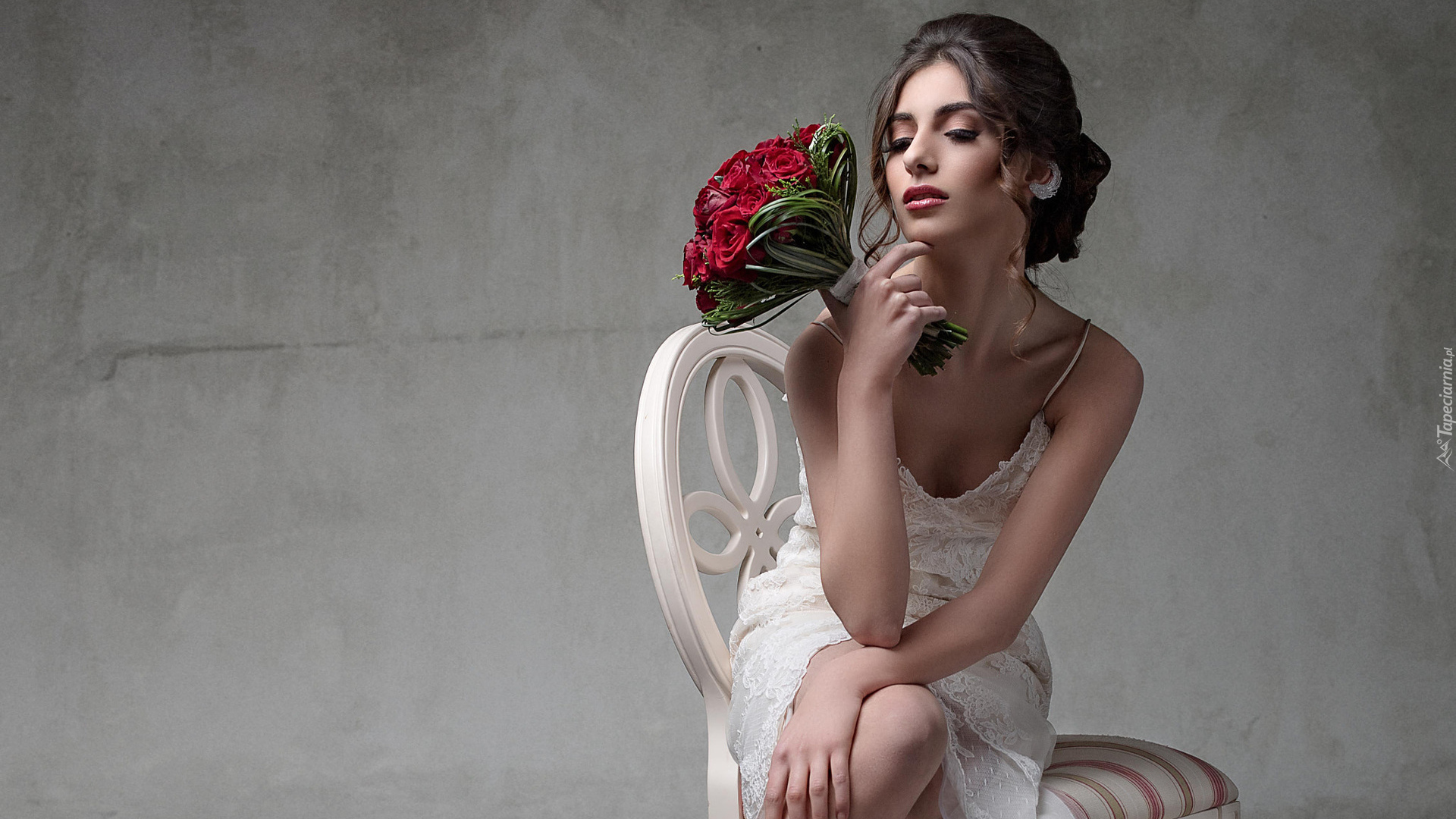 Edytor tapety: Dziewczyna siedząca na krześle z bukietem róż