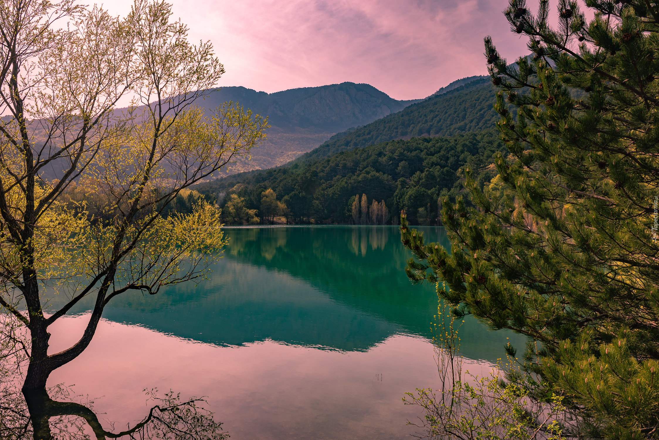 Edytor tapety: Drzewa nad jeziorem na tle gór