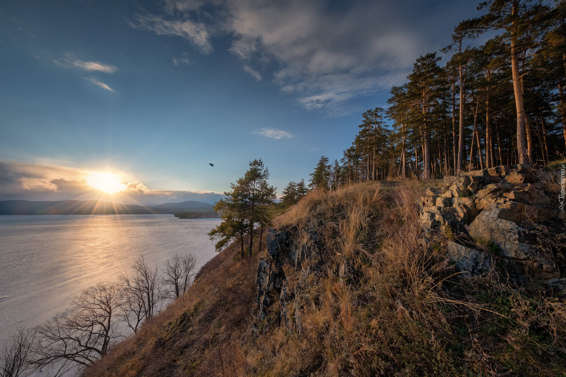 Edytor tapety: Wschód słońca nad jeziorem Turgoyak w Rosji