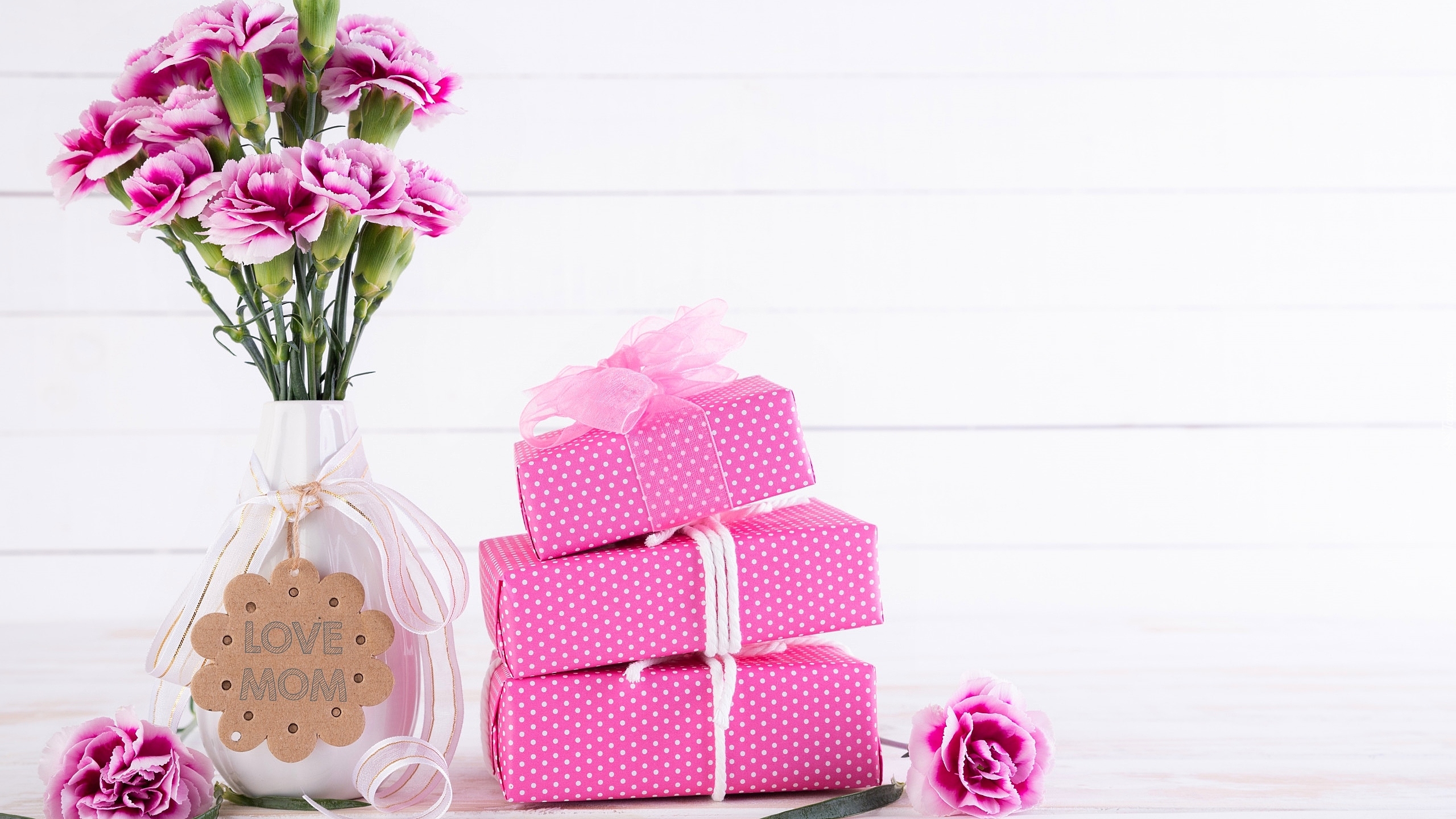 Edytor tapety: Goździki w wazonie i prezenty na Dzień Matki