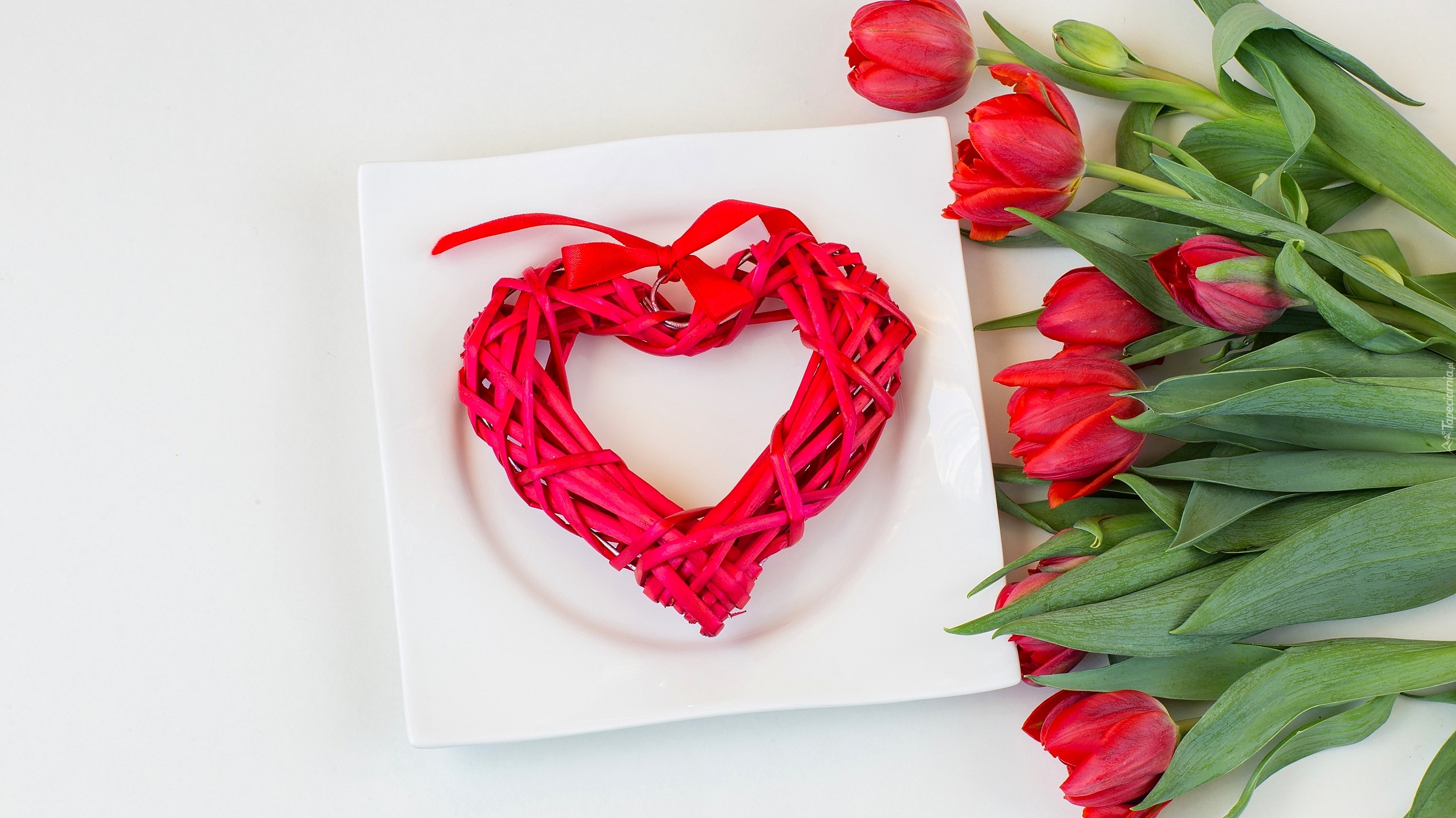 Edytor tapety: Wiklinowe serce na talerzu obok bukietu tulipanów