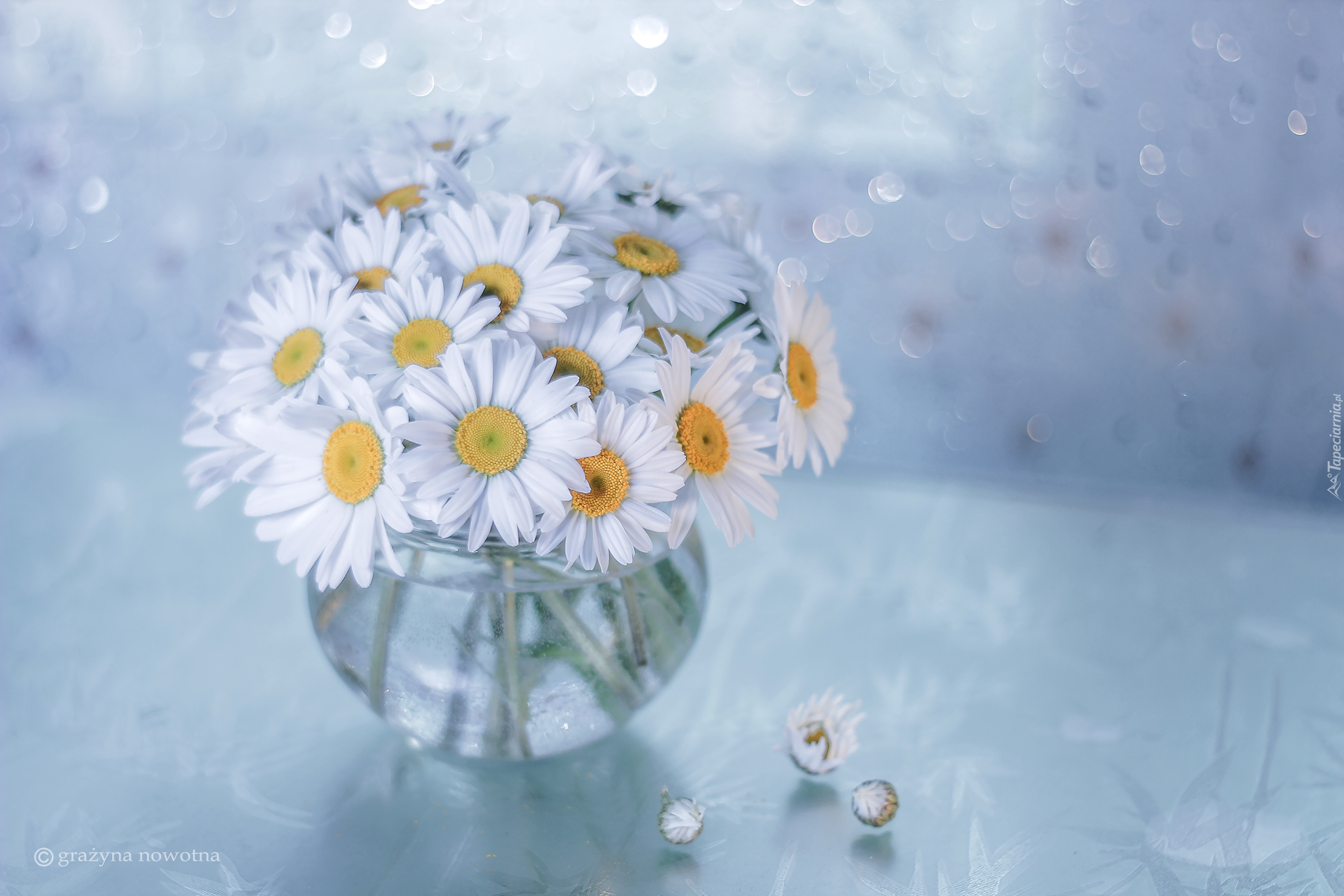 Edytor tapety: Białe margerytki w szklanym wazoniku