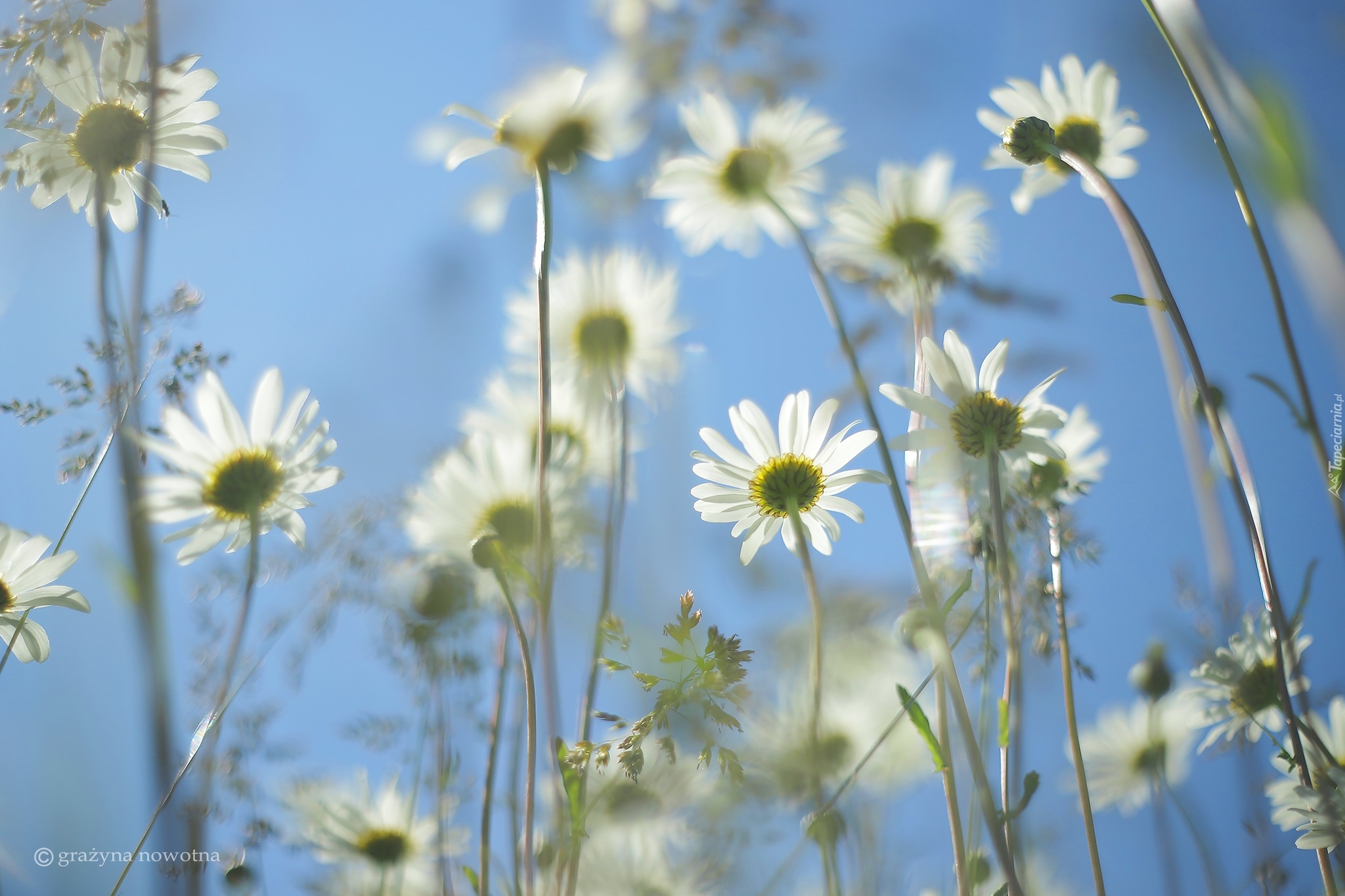 Edytor tapety: Margerytki i trawa na tle nieba