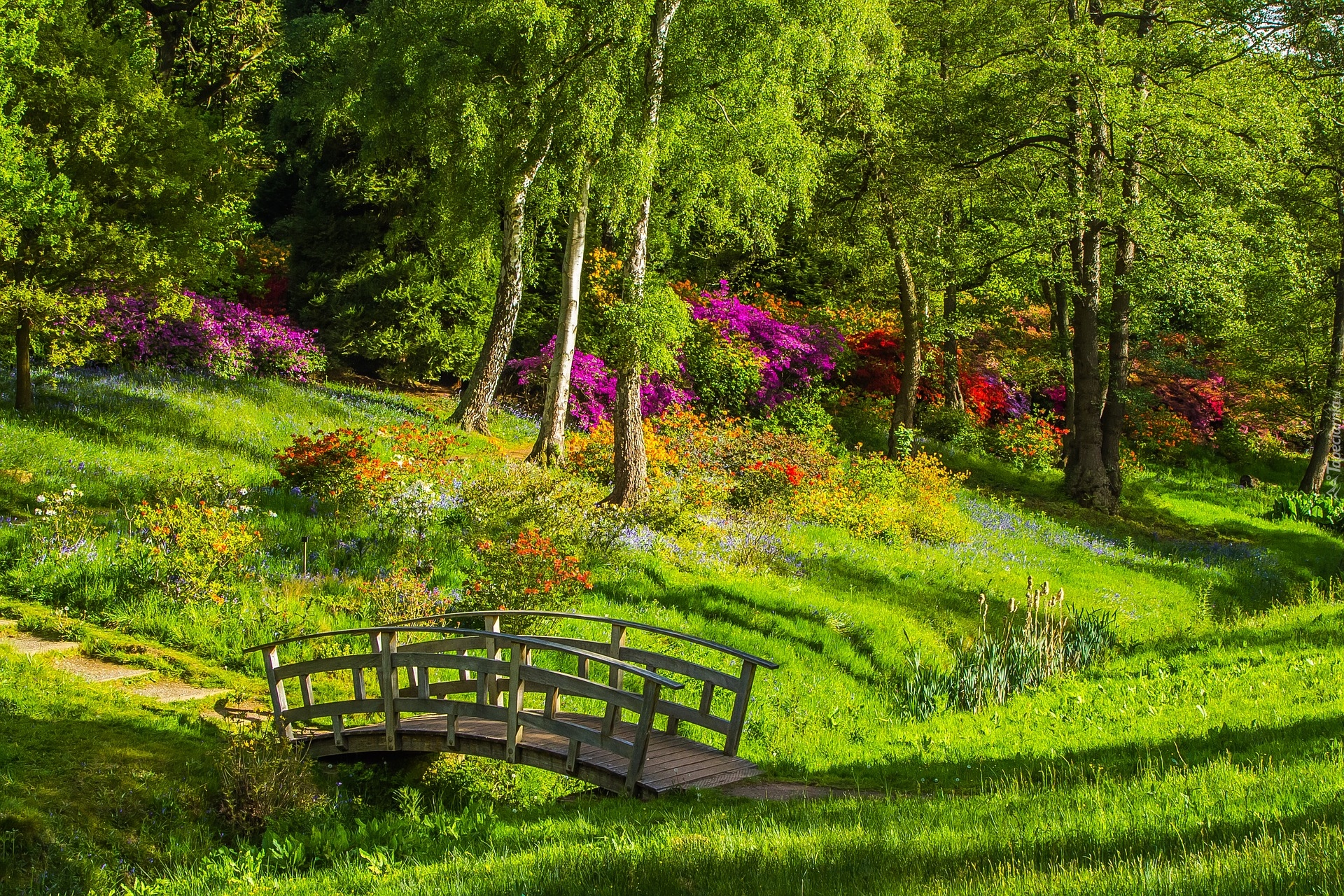 Edytor tapety: Mostek i kwitnące krzewy w parku Sharjah