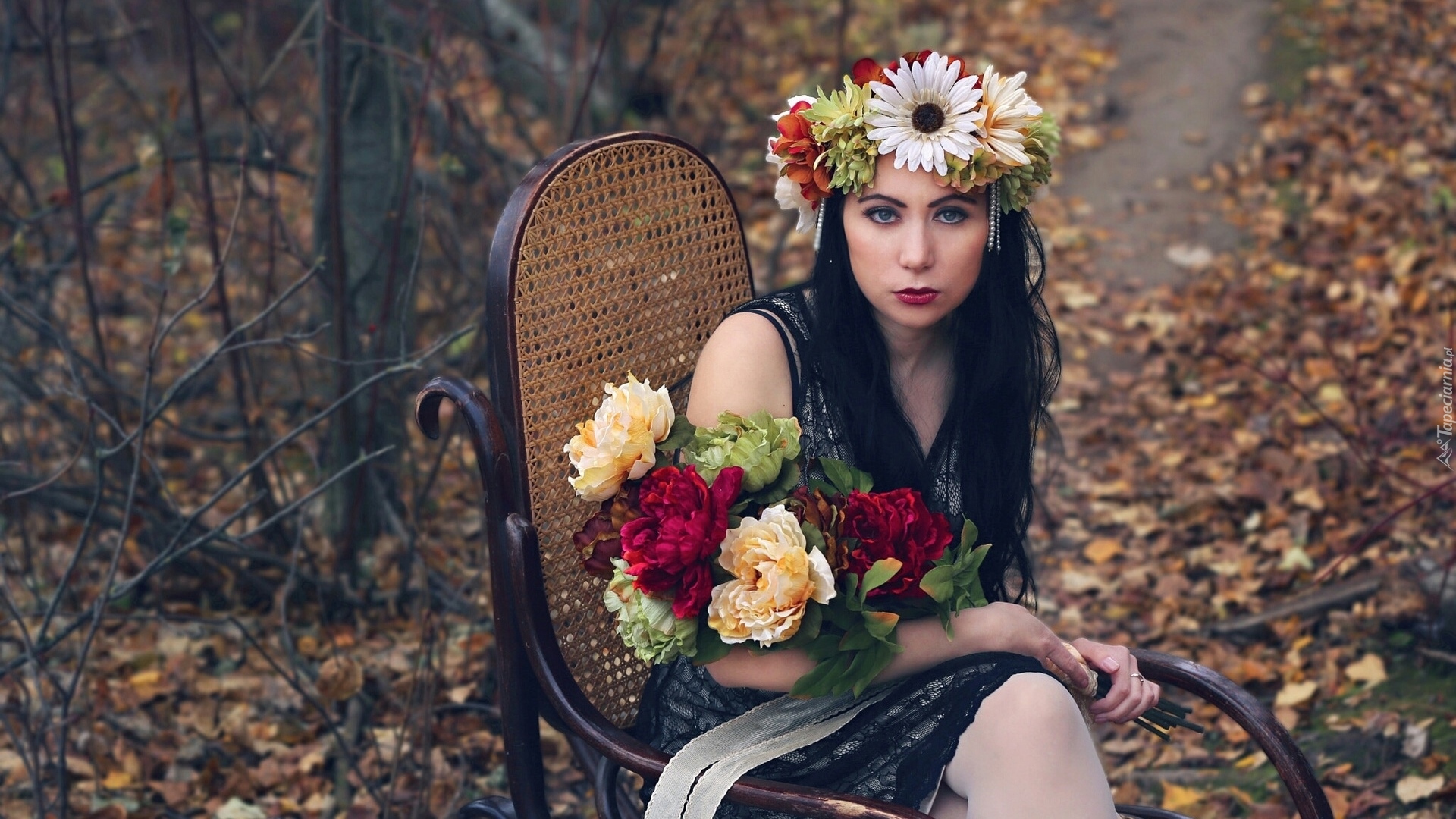 Edytor tapety: Dziewczyna na fotelu z wiankiem i bukietem kwiatów