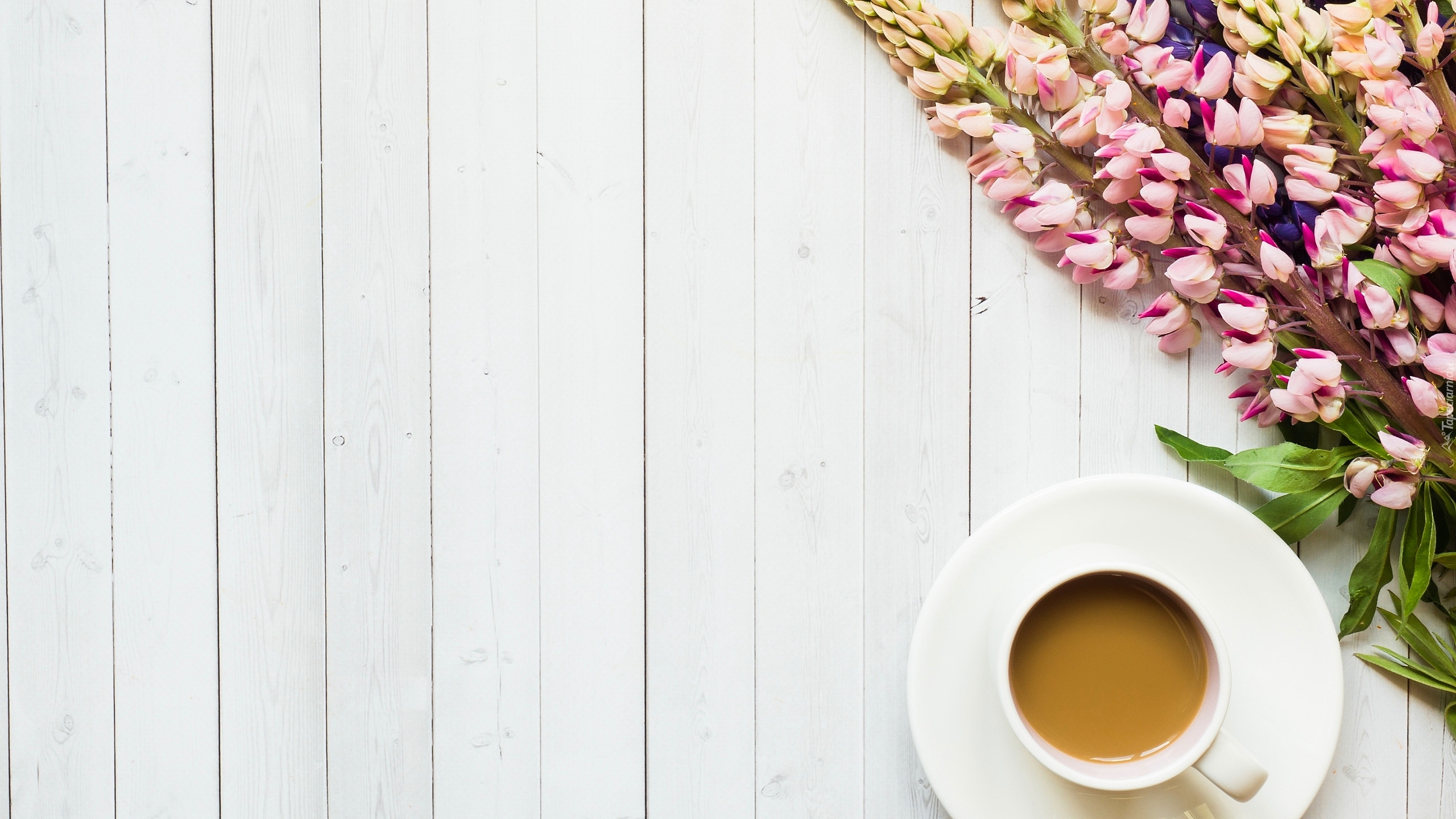 Edytor tapety: Filiżanka kawy obok łubinu