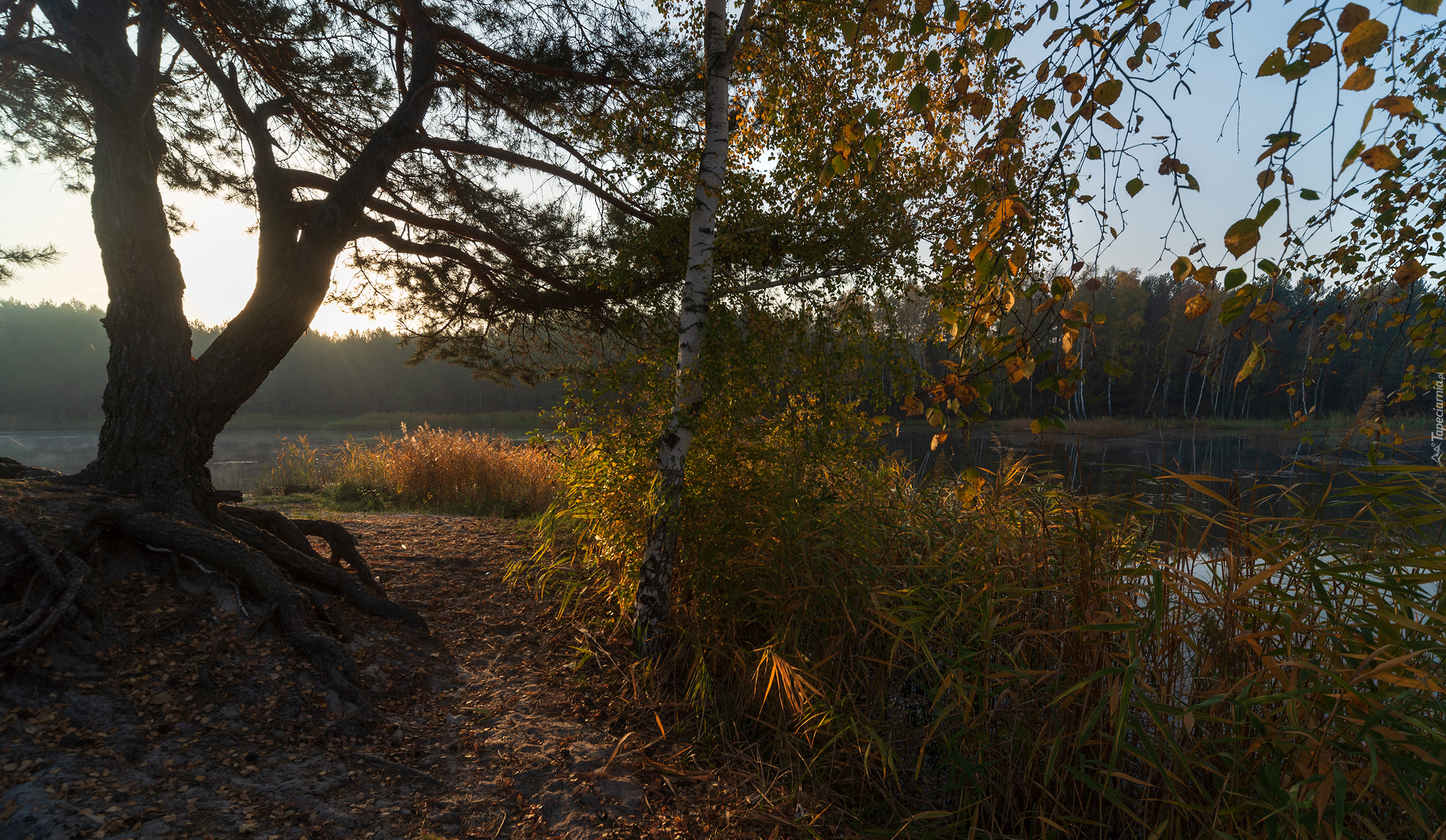 Edytor tapety: Jesienne drzewa i zarośla nad jeziorem