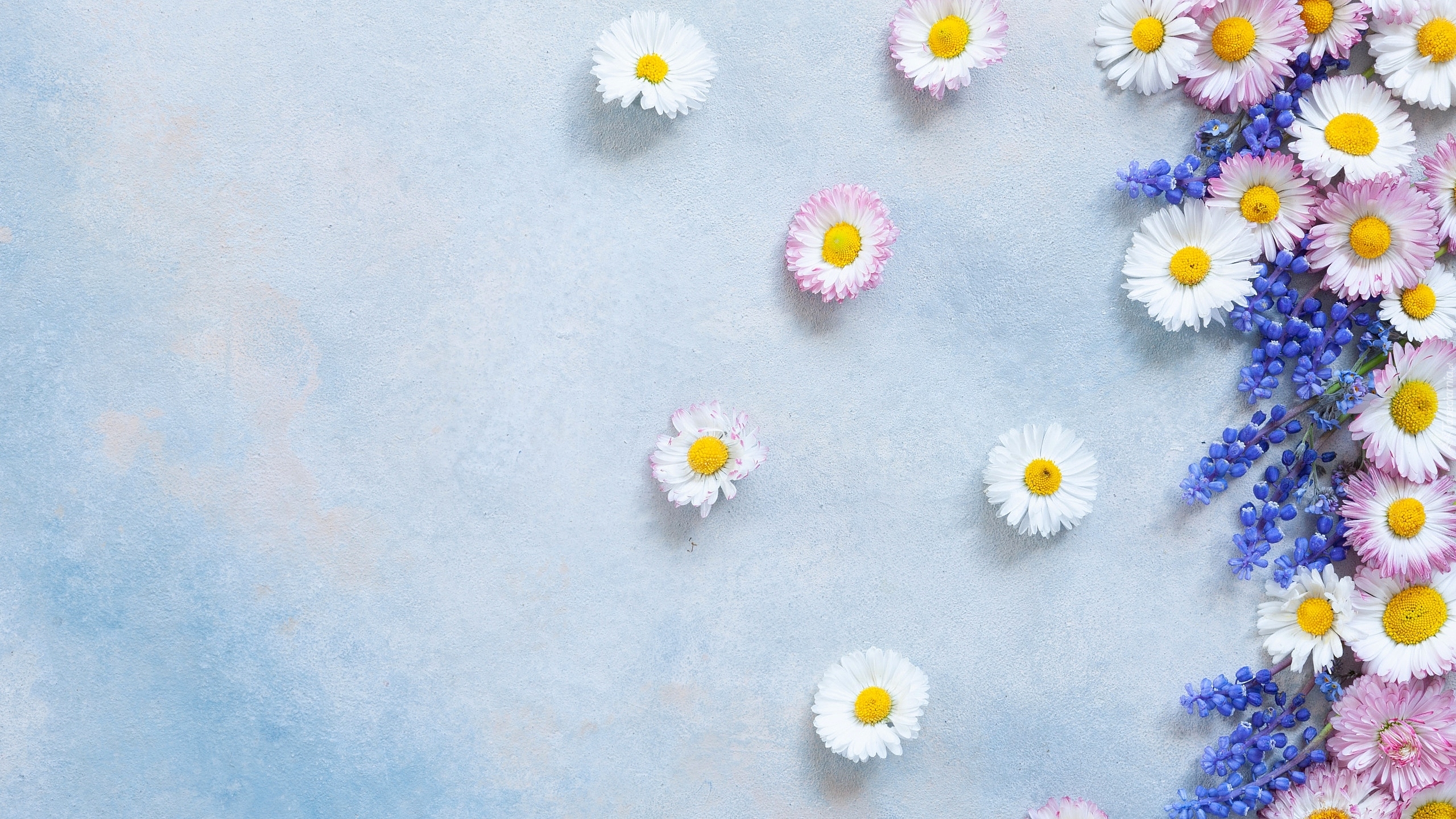 Edytor tapety: Stokrotki i szafirki na niebieskim tle