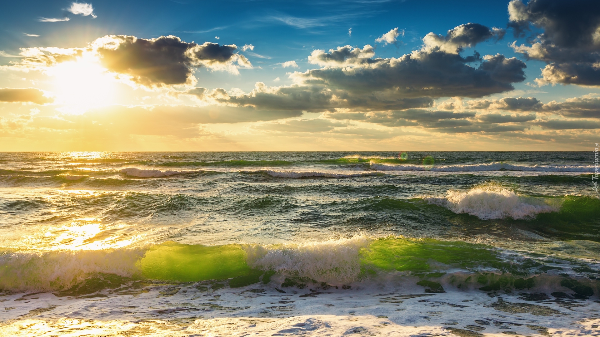 Edytor tapety: Fale na morzu we wschodzącym słońcu