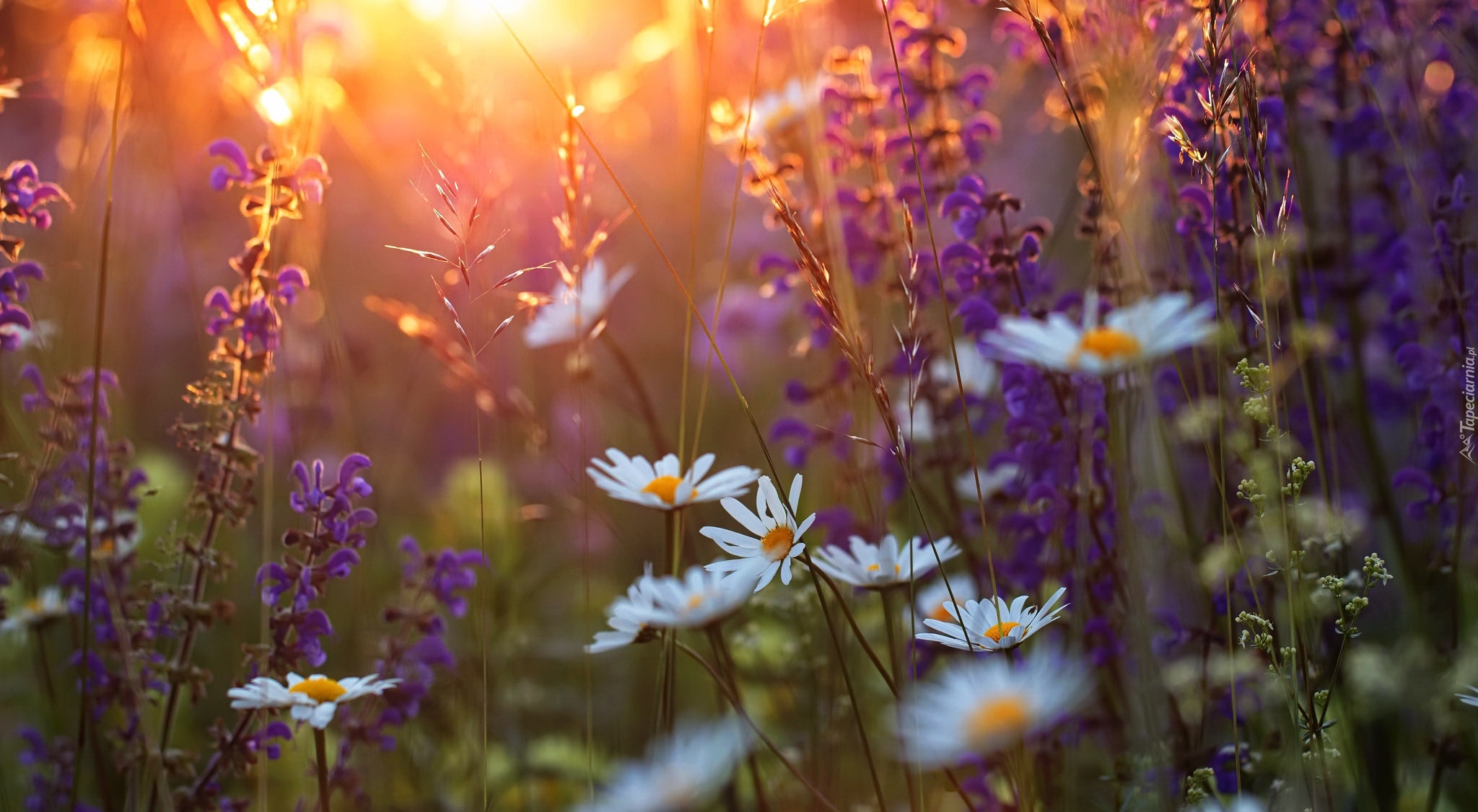 Edytor tapety: Promienie słońca nad polnymi kwiatami