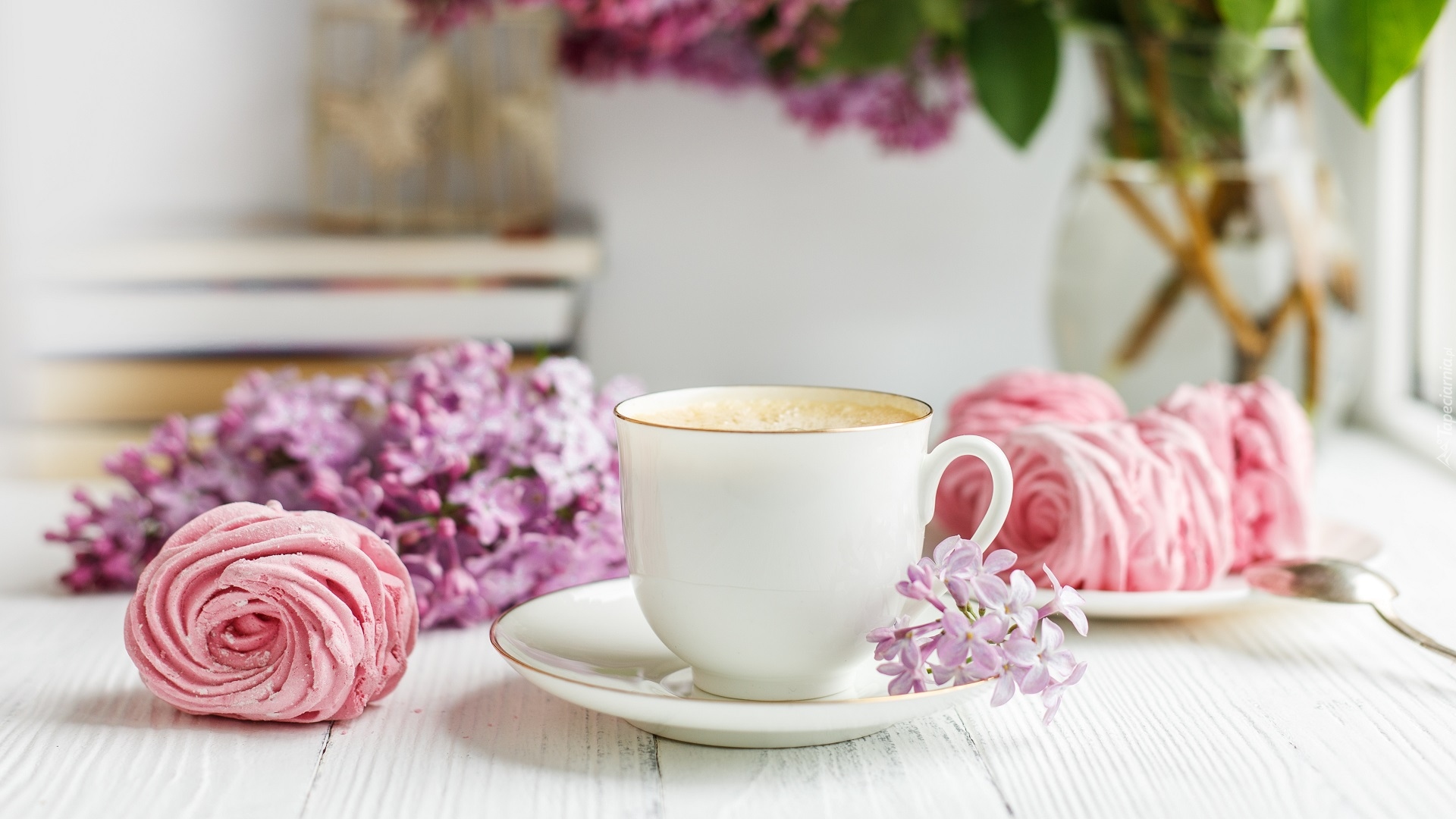 Edytor tapety: Biała filiżanka obok ciasteczka i bzu