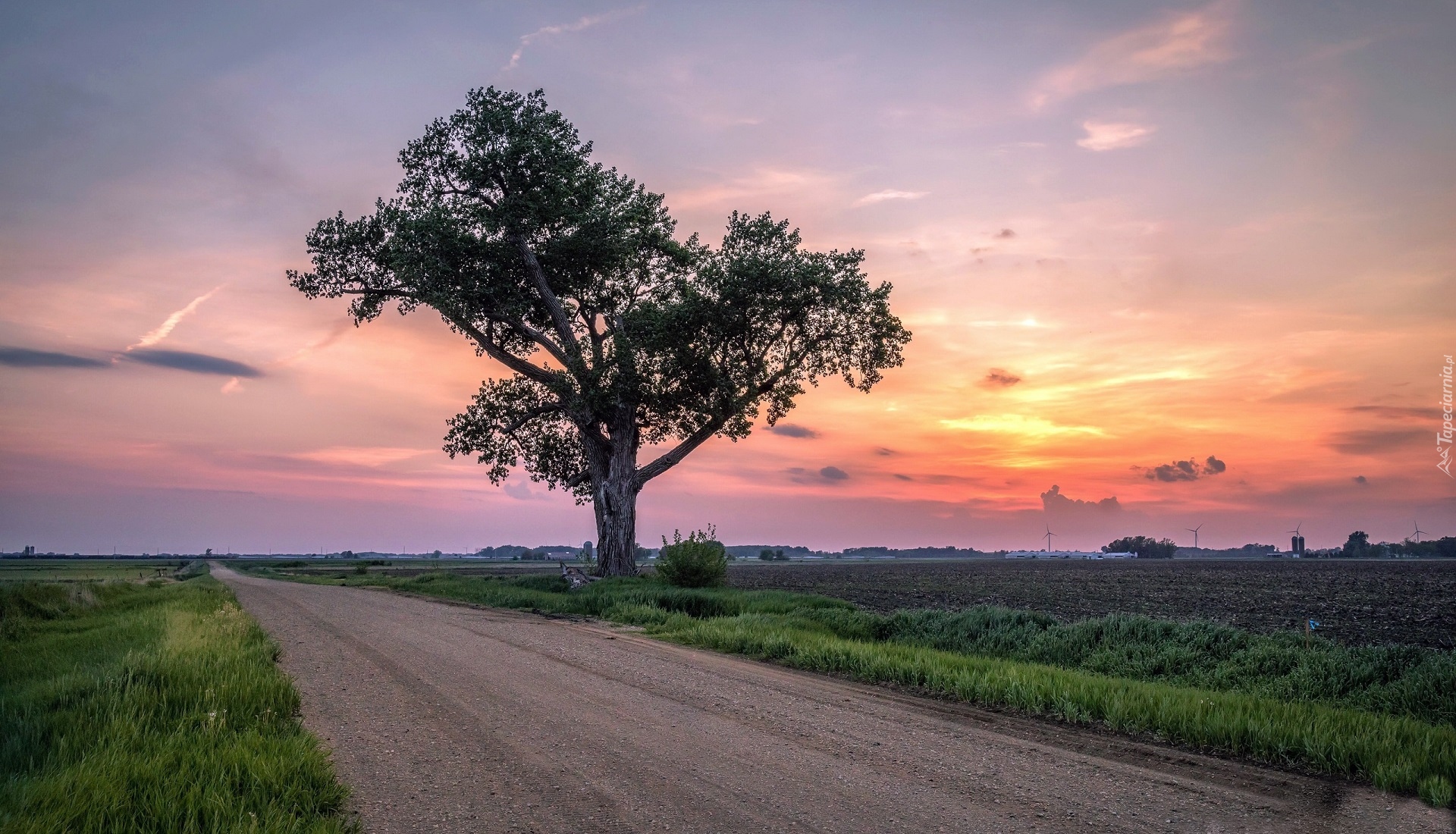 Edytor tapety: Drzewo przy drodze w blasku zachodzącego słońca
