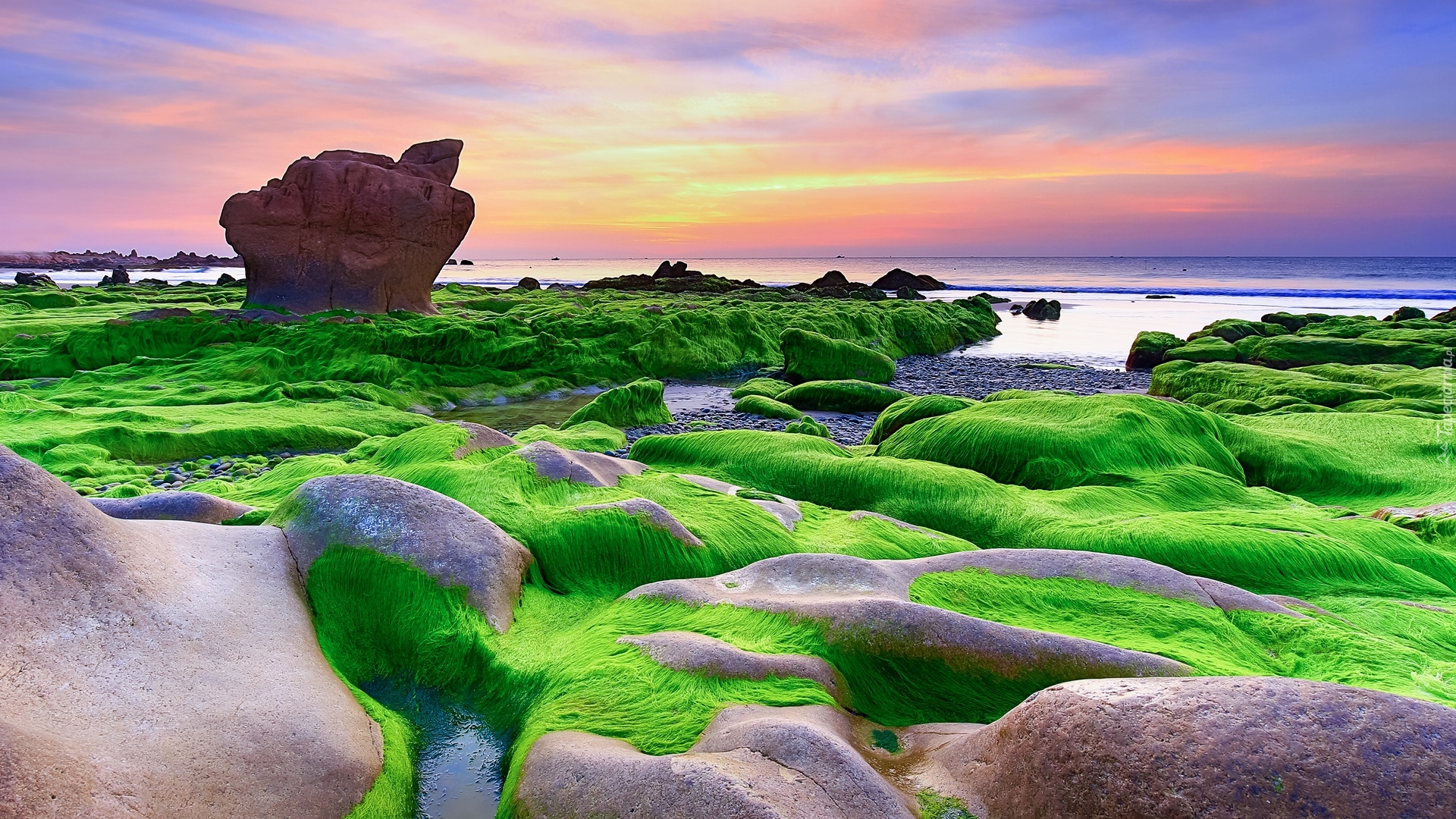 Edytor tapety: Skały porośnięte wodorstami na wietnamskiej plaży Nam O