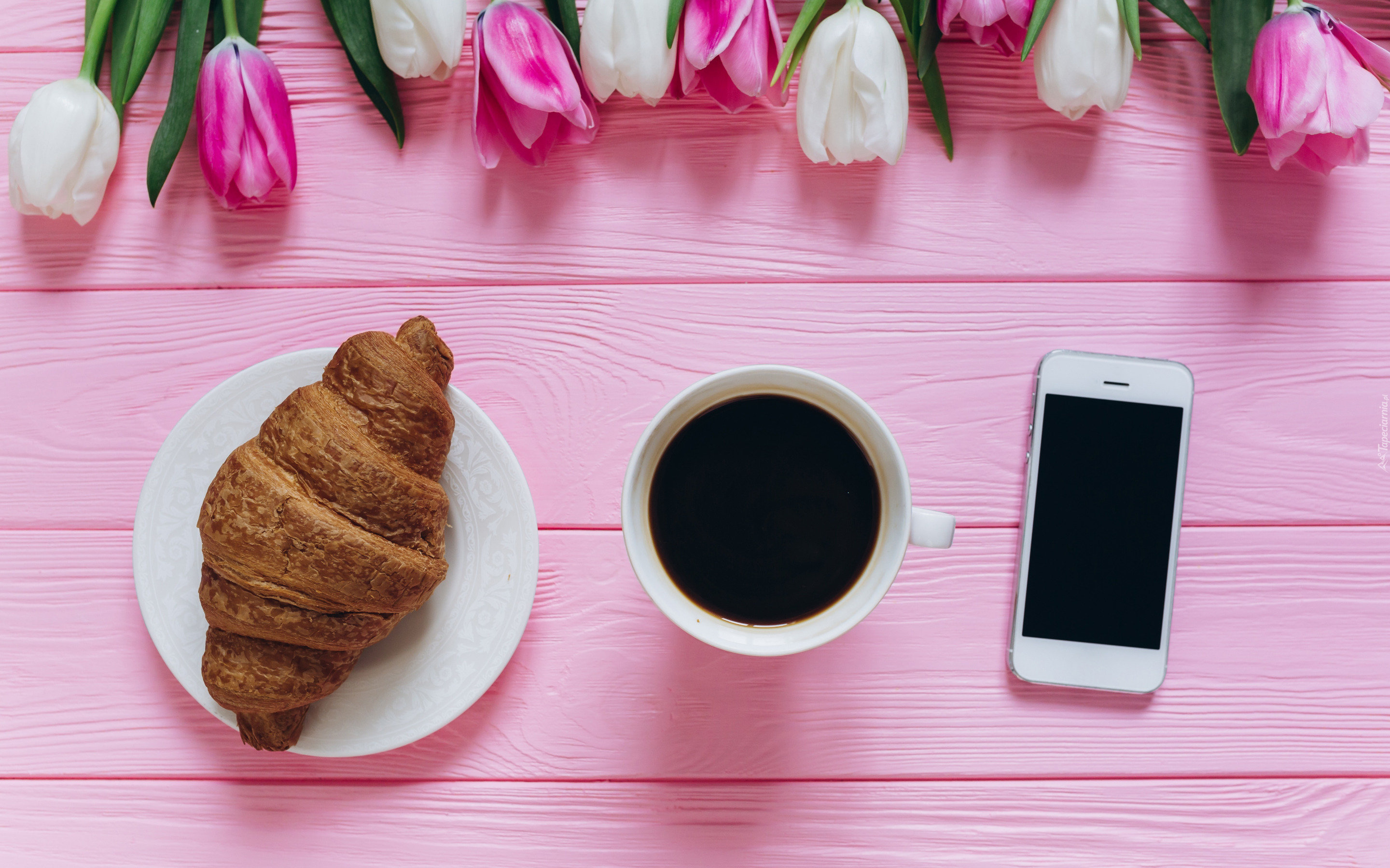 Edytor tapety: Kawa obok croissanta i telefonu przy tulipanach